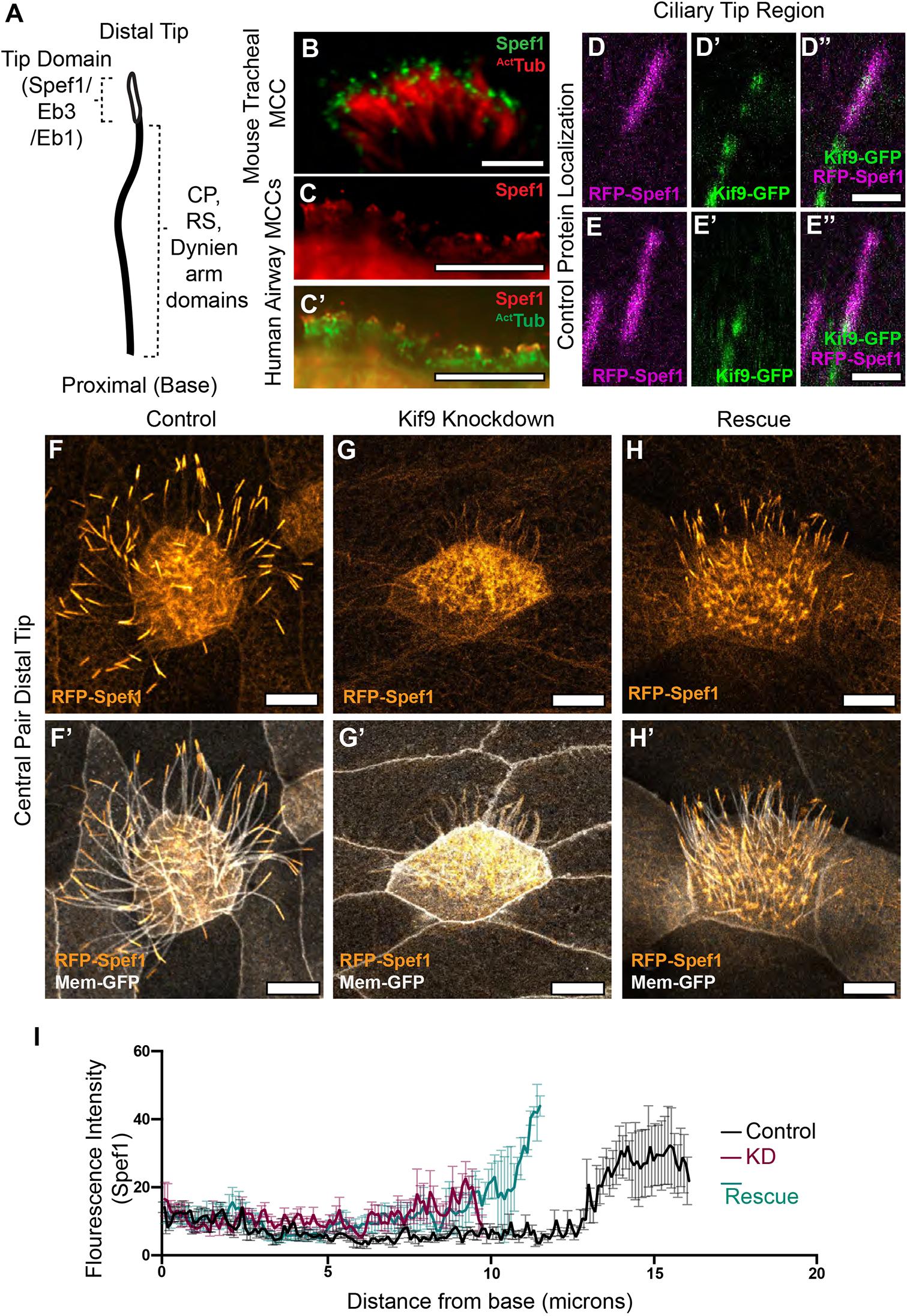 Figure 5. Kif9 contributes to distal tip integrity. (A) Schematic of proximal to distal patterning of the motile cilium. Tip domain schematized with proteins known to localize to that domain, as well as proteins localizing to the rest of the axonemes. (B) Images of immunostaining of Spef1 in mouse tracheal multiciliated cells (MCCs). Spef1 in green, acetylated tubulin (ActTub) in red. (C,Câ²) Images of immunostaining of human airway multiciliated cells. Spef1 in red, acetylated tubulin in green. (DâEâ³) Confocal images of RFPâSpef1 (magenta) and Kif9âGFP (green) colocalization in the distal tips of the cilium. (FâHâ²) Confocal images of RFPâSpef1 (orange) and MembraneâGFP (gray) in control (F,Fâ²), Kif9 MO-injected (G,Gâ²), and rescue (H,Hâ²) embryos. (I) Plot showing RFPâSpef1 fluorescence intensity as a function of axoneme length. Note the higher intensity for RFPâSpef1 at the distal end of control but not Kif9-KD axonemes. Note too that both axoneme length and distal Spef1 enrichment are partially rescued by re-expression of Kif9 (N=45 control axonemes; 45 Kif9-KD axonemes; 42 rescue axonemes; data compiled from 15 embryos across three independent experiments). Scale bars: 1â µm in B; 10â µm in C,Câ²,FâHâ²; and 2â µm in DâEâ³. |