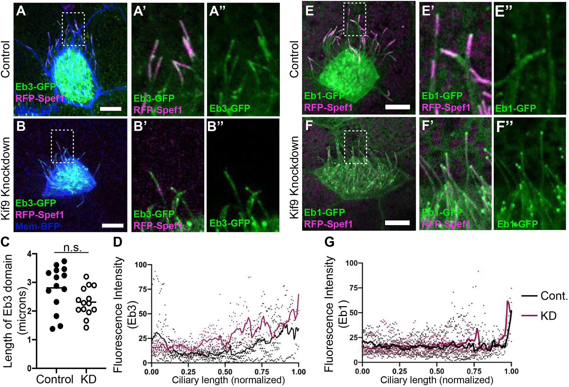 Figure 6. The microtubule plus-end-binding proteins Eb1 and Eb3 remain unaffected in the distal tip upon knockdown of Kif9. (AâBâ³) Confocal images of control (AâAâ³) and Kif9 MO-injected embryos (BâBâ³) with Eb3âGFP (green), RFPâSpef1 (magenta), and MembraneâBFP (blue). (Aâ²,Bâ²) Magnified views of area highlighted in A,B of ciliary tips with Eb3âGFP (green) and RFPâSpef1 (magenta) in control and KD cilia. (Aâ³,Bâ³) Magnified views of area highlighted in A,B of Eb3 alone in control and KD cilia. (C) Length measurements of Eb3 domain in control and Kif9 KD embryos. n.s., not significant (P=0.056) (unpaired two-tailed t-test). (D) Graph of line traces of fluorescence intensities of Eb3 in control and knockdown cilia. (EâFâ³) Confocal images of control (EâEâ³) and Kif9 MO-injected embryos (FâFâ³) with Eb1âGFP (green), RFPâSpef1 (magenta) and MembraneâBFP (blue). (Eâ²,Fâ²) Magnified views of area highlighted in E,F of ciliary tips with Eb1-GFP (green) an RFPâSpef1 (magenta) in Control and Knockdown cilia. (Eâ³âFâ³) Magnified views of area highlighted in E,F of Eb1 alone in control and KD cilia. (G) Graph of line traces of fluorescence intensities of Eb1 in control and KD cilia. Images are representative of 30 different axonemes quantified across three independent replicates with 10 different embryos imaged for each replicate. Scale bars: 10â µm. |