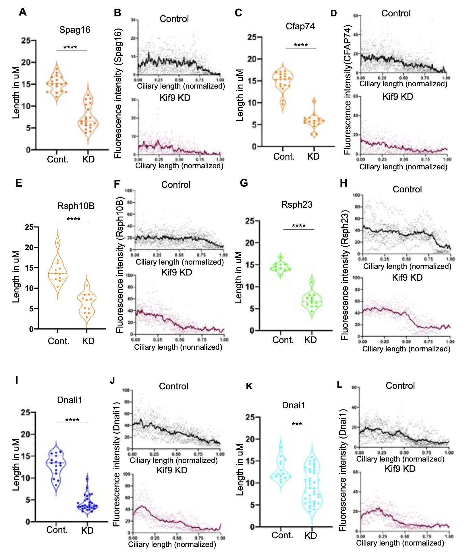 Kif9 is an active kinesin motor required for ciliary beating and proximodistal patterning of motile axonemes.