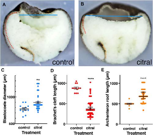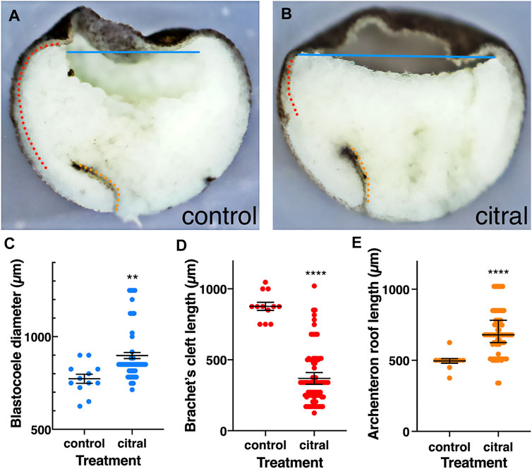 FIGURE 6. Internal reorganization of the embryo as a result of reduced RA signaling. Control (n = 12) and citral-treated (n = 84) embryos were incubated to mid-gastrula (st. 11) and bisected sagittally. (A,B) Control and citral-treated bisected embryos. Blastocoele diameter, blue line; Brachetâs cleft; dotted red line; Archenteron roof, dotted orange line. (C) Distribution of the blastocoel diameter in control and citral-treated embryos. (D) Measurement of Brachetâs cleft length in citral-treated and control embryos. (E) Length of the archenteron roof in citral-treated and control embryos. Citral-treated embryos were compared to the control values. **, p < 0.01; ****, p < 0.0001. |