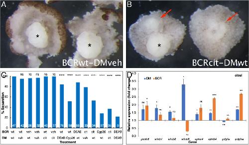 FIGURE 7. RA regulates the tissue separation behavior across Brachetâs cleft. Embryos were manipulated to reduce RA signaling levels by treatment with DEAB, citral, or injected with mRNA encoding CYP26A1. For controls, embryos were treated with the diluent alone (veh) for the DEAB or citral dilutions or left untreated (wt). The explanted BCR or DM regions were analyzed separately or conjugated for the separation behavior assay. (A) Control examples of separation behavior assay conjugates between control (wt) BCR and vehicle (veh) treated DM (asterisk). (B) Loss of separation behavior (arrows) when control DM was placed onto BCR treated with citral. * indicates a DM that did remain separated. (C) The extent of separation behavior (%) in all the assays performed in all combinations. # separation/# total: 47/47 DMwt/BCRwt; 40/42 DMveh/BCRwt; 25/26 DMwt/BCRveh; 31/32 DMveh/BCRveh; 40/40 DMcit/BCRwt; 37/37 DMcit/BCRveh; 64/76 DMDEAB/BCRwt; 30/58 DMCyp26/BCRwt; 52/59 DMwt/BCRDEAB; 26/33 DMveh/BCRcit; 18/34 Dmwt/BCRcit; 19/67 DMwt/BCRCyp26; 13/35 DMcit/BCRcit; 2/9 DMDEAB/BCRDEAB. (D) qPCR analysis of pcdh8, efnb1, efnb2, efnb3, epha4, ephb4, pdgfa, and pdgfra gene expression changes in the DM and BCR following citral treatment. **, p < 0.01; ***, p < 0.001; ****, p < 0.0001; ns, not significant. |