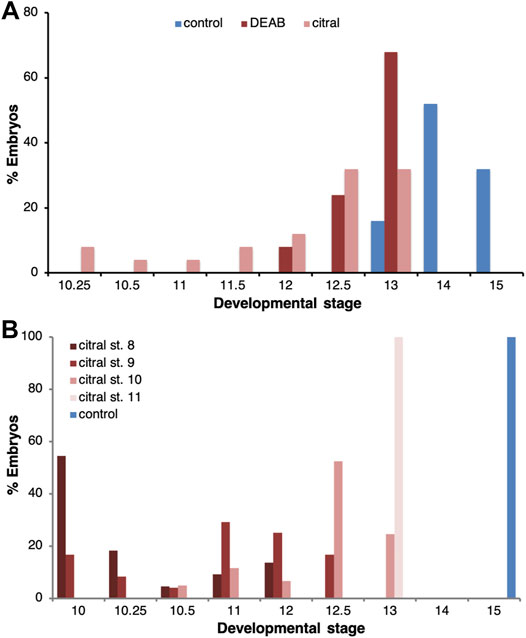 FIGURE 1. Delayed progression through gastrulation as a result of RA biosynthesis inhibition. (A) The progression of embryos through gastrulation treated with DEAB (300 μM; n = 38) or citral (70 μM; n = 39) to inhibit RA biosynthesis. When the majority of control embryos reached early neurula (st. 14/15; n = 38), the stage distribution of the treated samples was determined. The percentage of embryos at each stage in each treatment is shown. (B) The temporal sensitivity window for the delay in gastrulation induced by inhibition of RA biosynthesis was studied by initiating the citral treatment at different developmental stages (8, n = 22; 9, n = 24; 10, n = 61; 11, n = 24). When control embryos reached early neurula (st. 15), the stage distribution of the treated samples was determined. The percentage of embryos at each stage in each treatment is shown. |