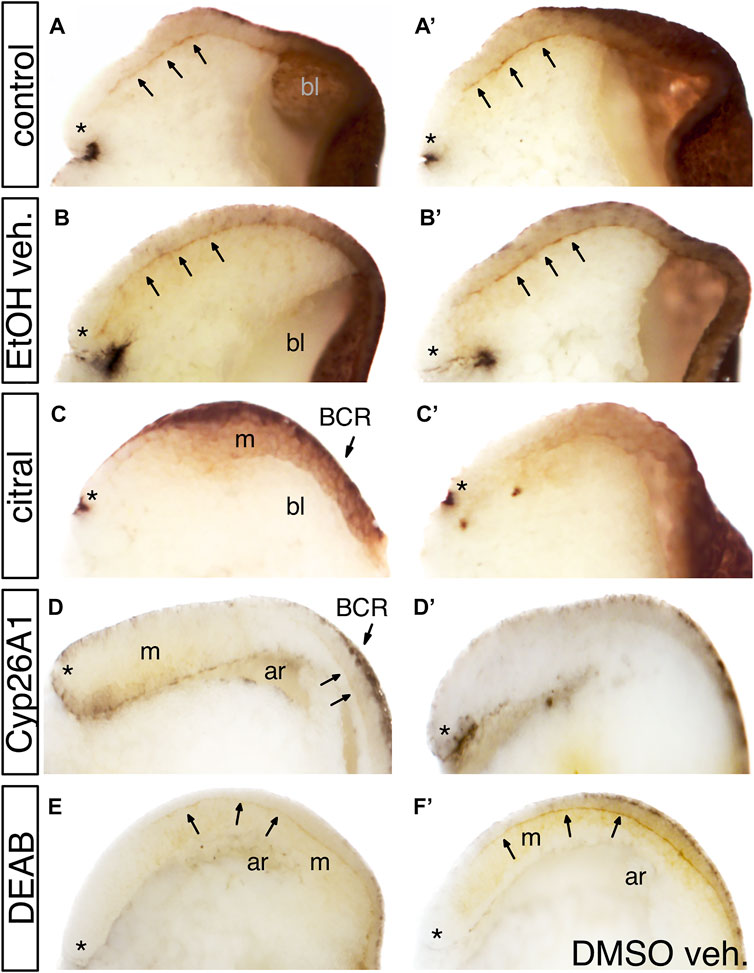 FIGURE 3. The effect of reduced RA signaling on fibronectin (FN) deposition. Embryos were treated with DEAB or citral or injected with RNA encoding CYP26A1 to reduce RA levels. (A,Aâ²) Two examples of untreated sibling control embryos. Arrows point to fibronectin deposited along Brachetâs cleft. * indicates the dorsal lip of the blastopore; bl, blastocoel. (B,Bâ²) Two examples of embryos treated with EtOH vehicle only. FN deposition was equivalent to untreated controls. (C,Câ²) Two examples of embryos treated with citral. FN is detected in the ectoderm of the blastocoel roof (BCR) and mesoderm (m), but is not deposited along Brachetâs cleft. (D,Dâ²) Two examples of embryos injected with cyp26a1 mRNA. FN is not detected in the BCR, the mesoderm (m), or Brachetâs cleft (arrows). ar, archenteron. (E) Embryo treated with DEAB showed reduced FN staining along Brachetâs cleft compared to a sibling embryo treated only with DMSO vehicle (F). |
