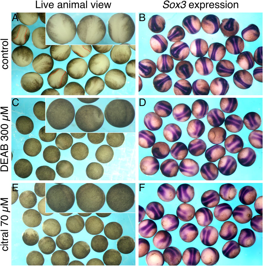 FIGURE 4. Reduced RA signaling affects the apparent location of the neural plate. Embryos were treated with DEAB or citral to inhibit the biosynthesis of RA. At st. 15, embryos were analyzed for the formation of the neural plate while alive by visual examination (A,C,E), or after in situ hybridization with the neural plate marker, sox3 (B,D,F). (A,B) Control embryos (n = 25). (C,D) Embryos treated with DEAB (300 μM; n = 23). (E,F) Treatment of embryos with citral (70 μM; n = 26). |