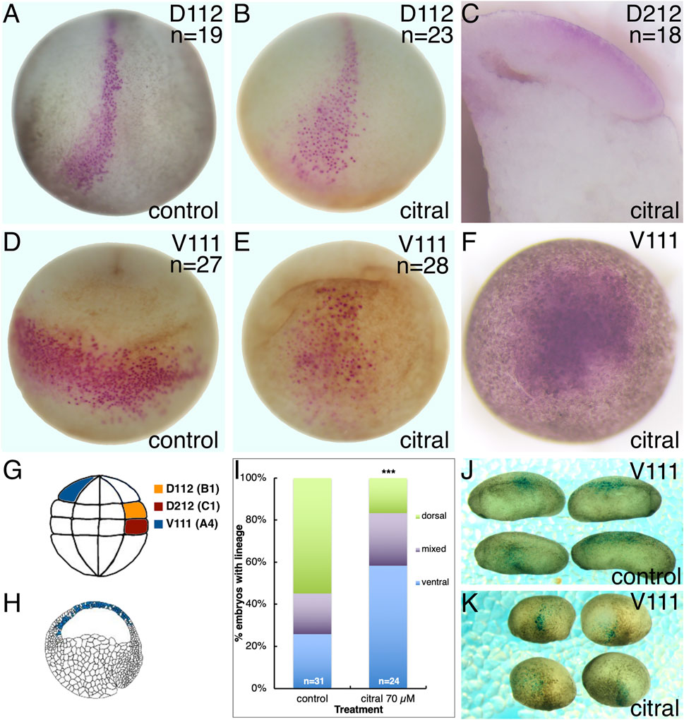 FIGURE 5. Reduced RA signaling does not alter the dorsal-ventral axis. Single 32-cell blastomeres were injected with lineage tracer mRNA and labeled clones mapped at different developmental stages. (A,B) At stage 15, the D112/B1 clone (pink cells) occupies the medial and anterior neural plate in both untreated control (A) and citral treated (B) embryos. Dorso-anterior views. (C) The D212/C1 blastomere that normally contributes to the involuting dorsal mesoderm at gastrulation (st 10.5; Bauer et al., 1984) also does so in citral-treated embryos. Mid-sagittal section with anterior to the left and dorsal to the top. (D) At stage 17, the V111/A4 clone in untreated control embryos forms a coherent ventrolateral clone. Ventral view with anterior to the top. (E) In citral-treated sibling embryos, the stage 17 V111/A4 clone remains medial, i.e., has not expanded laterally, and the cells are more dispersed. Ventral view with anterior to the top. (F) At gastrula stages (st 10.5), the V111/A4 clone in citral-treated embryos occupies the blastocoel roof, similar to control embryos (cf. H). (G) Location of the 32-cell blastomeres that were lineage traced. Dorsal to the right, animal to the top. (H) Location of the V111/A4 clone (blue cells) at early gastrulation, modified from Bauer et al. (1984). Animal to the top and dorsal to the right. (I) Percentage of embryos in which the V111/A4 clone was located predominantly in the dorsal, ventral, or both (mixed) epidermis at tailbud stages. (J) Examples of control embryos showing V111/A4 descendants (blue cells) mostly in the dorsolateral epidermis. Dorsal to the top, anterior to the left. (K) Examples of citral treated embryos showing V111/A4 descendants (blue cells) mostly in the ventral and ventrolateral epidermis. Dorsal to the top, anterior to the left. |