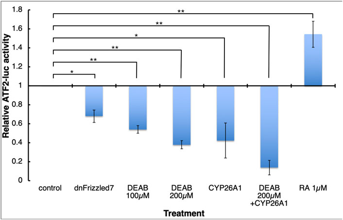 FIGURE 8. RA signaling is necessary for normal Wnt/PCP activity. Embryos were injected with the ATF2-based non-canonical Wnt signaling reporter plasmid and subjected to DEAB or RA treatments, or co-injected with mRNA encoding dominant-negative Frizzled 7 or CYP26A1. During late gastrula (st. 12) embryos were collected and analyzed and the effect on the reporter activity (luciferase) was determined. *, p < 0.05; **, p < 0.01. |
