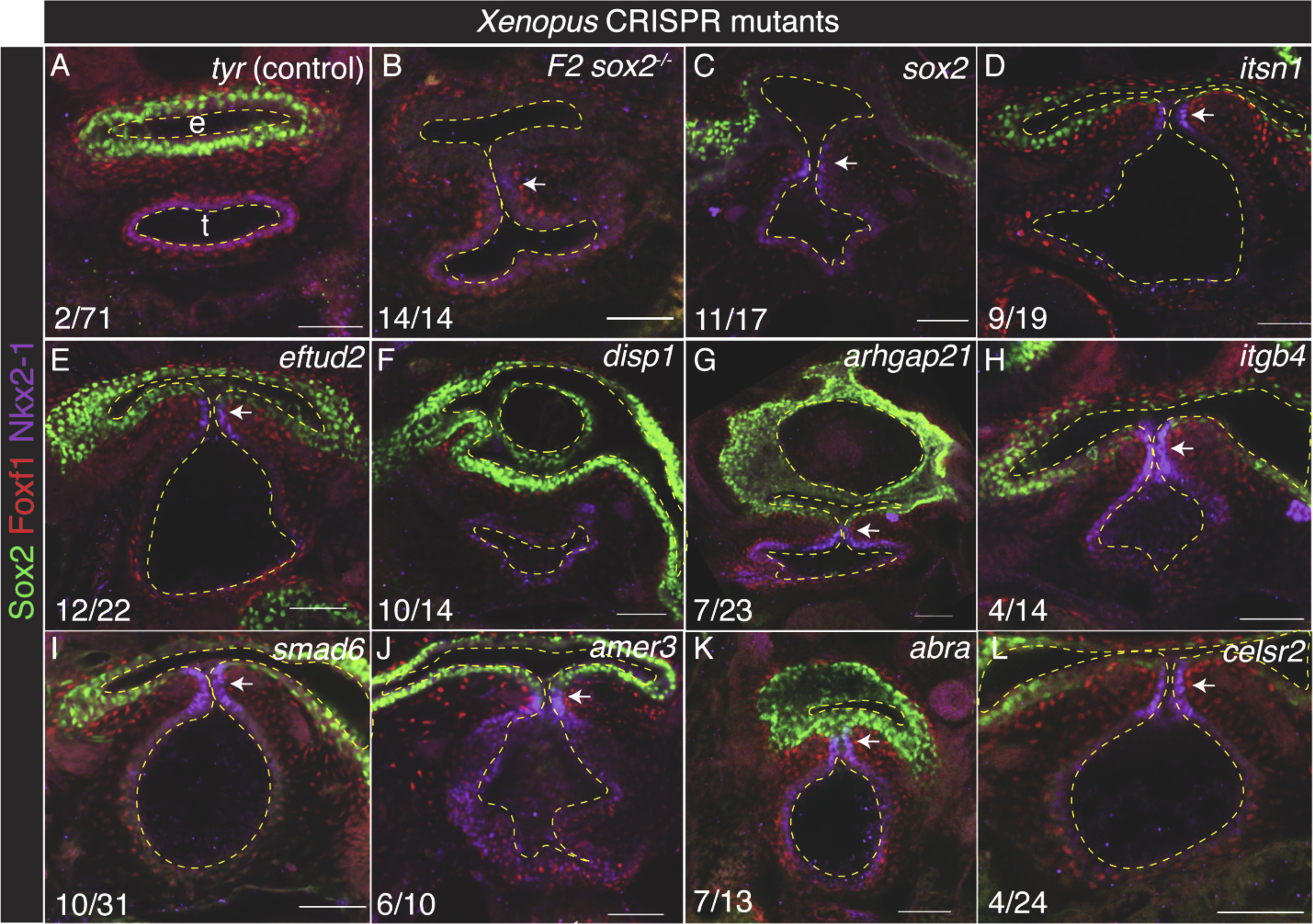 Figure 3. CRISPR-mutation of candidate risk genes in Xenopus disrupts trachea-esophagus morphogenesis(A–G) Representative confocal microscopy images of NF44 foregut from Xenopus CRISPR mutants. Sox2 F0 CRISPR mutants (C) have the same trachea-esophageal phenotype as sox2−/− F2 germline mutants (B), validating the F0 screen. Compared to control tyr mutations in which the trachea (t) and esophagus (e) have completely separated (A), mutation of 13/18 genes caused a failure of the foregut to separate into distinct trachea and esophagus (D–E and H–L) and/or resulted in a disrupted esophagus with multiple lumens (F and G). Dashed lines indicate the esophagus, trachea, and foregut lumens. Arrows point to a tracheoesophageal cleft. The number of embryos with a TED phenotype/total injected. Scale bars represent 50 μm.