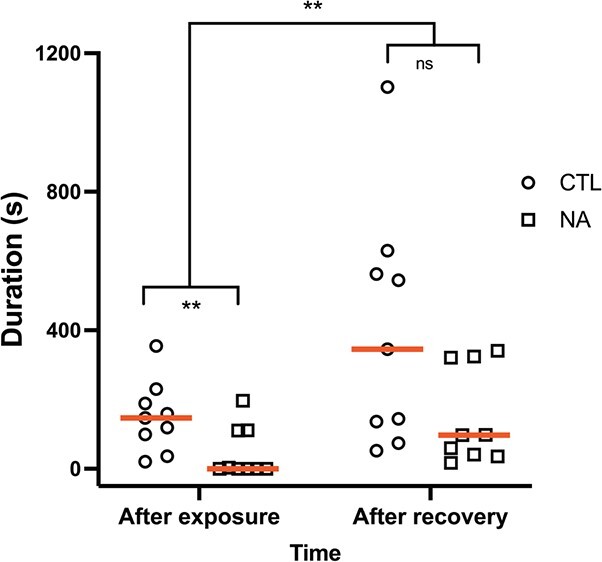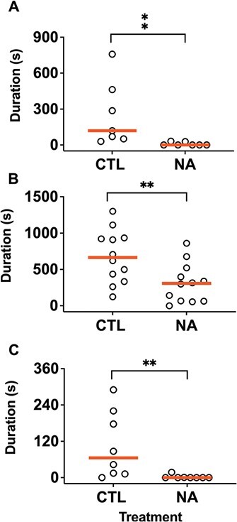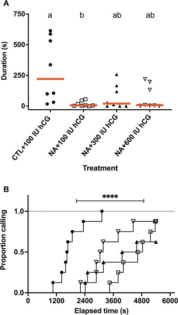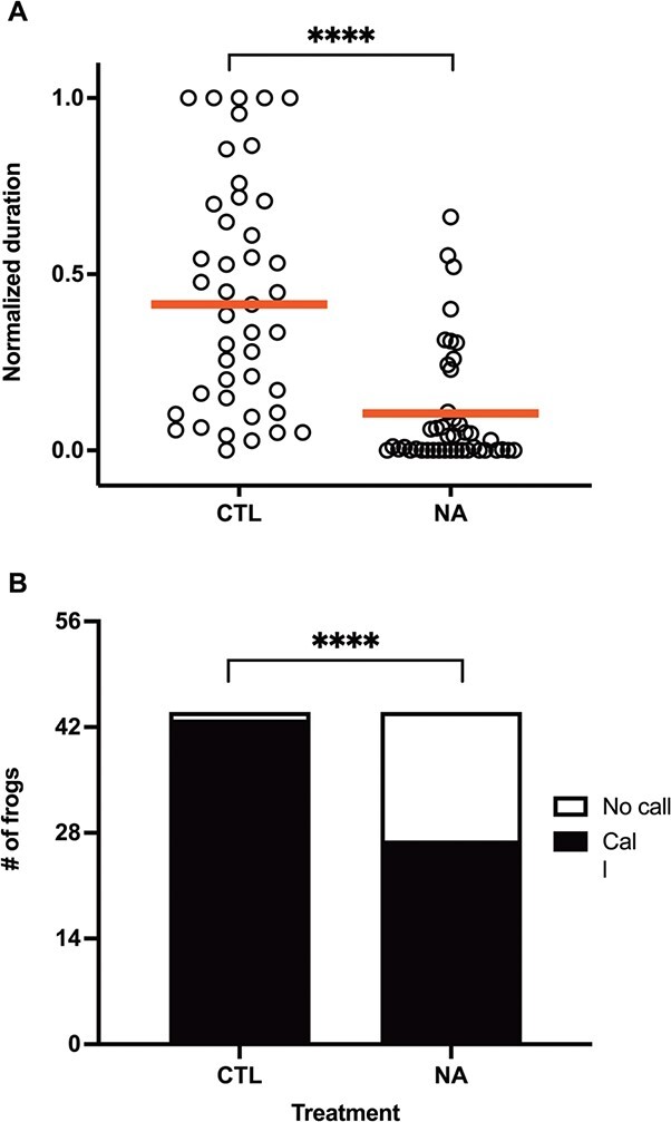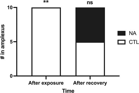 Naphthenic acids (NAs), the carboxylic acids found in petroleum, are of emerging concern as they contaminate coastlines after oil spills, leech into freshwater ecosystems of oil sands areas and have wide industrial applications. They are acutely toxic in fish and tadpoles and may be endocrine disruptors at sublethal levels. We characterized androgen-dependent courtship behaviours and their disruption by NAs in male Western clawed frogs, Silurana tropicalis. Courtship primarily consists of males producing low trills and achieving amplexus, a mating position where a male clasps a female. Adult males were exposed for 5 days to 20 mg/l NA and injected with human chorionic gonadotropin to induce calling. The duration of calling activity was significantly reduced by NA exposure. Other acoustic parameters such as dominant frequency, click rate and trill length were not affected. Vocalization and amplexus were both inhibited after NA exposure and restored after 2 weeks of recovery in clean water. To determine possible disruption at the level of the testes, the effects of NA exposure on gene expression of key players in steroidogenesis was determined. Exposure to NAs decreased srd5a on average by ~ 25%. The enzyme 5α-reductase, encoded by srd5a, converts testosterone to its more bioactive form 5α-dihydrotestosterone (DHT), so NAs may be affecting this steroidogenic step. However, the observed upregulation of lhr, star and cyp17a1 suggests that NA-exposed males may be attempting to counteract the reduced potential to produce DHT. Yet, these NA-exposed frogs have dramatically reduced calling duration, so the observed upregulation of star and cyp17a1 is decoupled from the vocalizations. Calling duration and the ability of males to amplex females is reversibly disrupted by NA exposure, implying that environmental reduction and removal of NAs may help improve habitability of contaminated ecosystems.