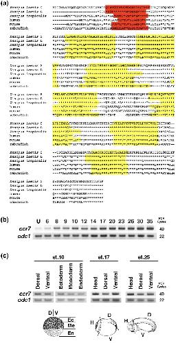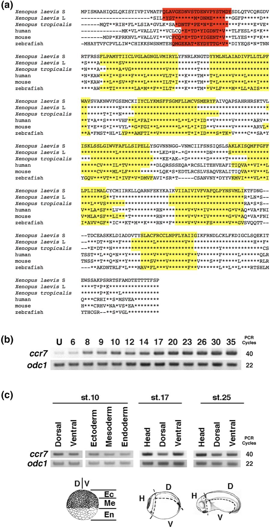 Figure 1. Ccr7 alignments and ccr7-expression patterns. (a) Alignment of the Xenopus laevis S Ccr7, Xenopus laevis L Ccr7, Xenopus tropicalis Ccr7, human Ccr7, mouse Ccr7, and zebrafish Ccr7 amino acid sequences. Asterisks (*) indicates conserved amino acids. The seven transmembrane helices predicted using the TMSEG method are shaded yellow, and a protein-binding domain predicted using the ProNA2020 method is shaded red. (b and c) Expression patterns of ccr7. odc1 expression was used as an internal control. (b) Temporal expression patterns of ccr7. U indicates unfertilized eggs. The numbers indicate the developmental stages. (c) Spatial expression patterns of ccr7. Dissections were performed at the indicated developmental stages. Abbreviations: D, dorsal; V, ventral;Ec, ectoderm; Me, mesoderm; En, endoderm; H, head.