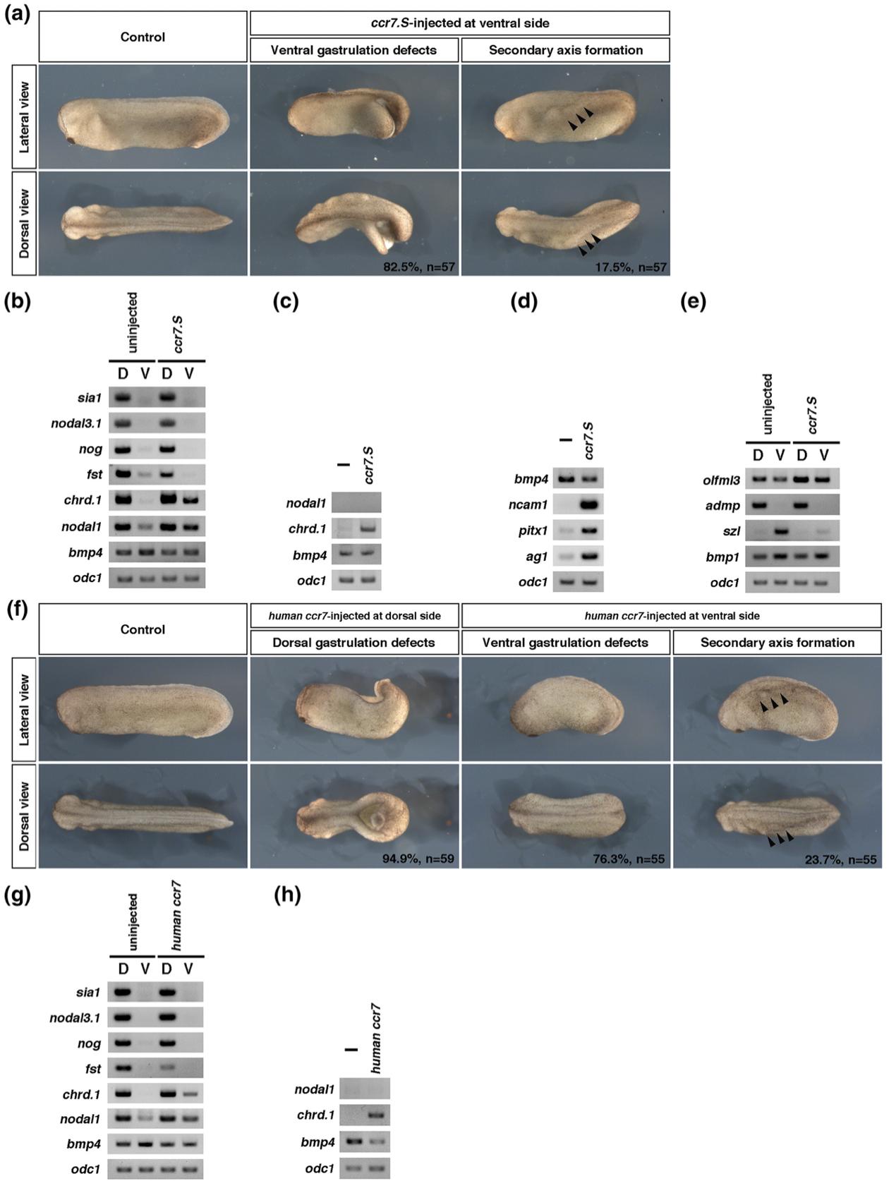 Figure 3. Effects of ccr7.S on differentiation. (a) Phenotypes of embryos ventrally injected with ccr7.S mRNA (st.28). The appearance rate of ventral gastrulation defects was 82.5% (n = 57), and the appearance rate of secondary axis formation was 17.5% (n = 57). Arrowheads indicate the secondary axis. (b) RT-PCR analysis of the dorsal or ventral sectors from embryos injected with ccr7.S mRNA (st.10). (c and d) RT- PCR analysis of the animal caps from embryos injected with ccr7.S mRNA. (c) (st.9) and (d) (st.25). (e) RT-PCR analysis of dorsalâ ventral patterning like (b). (f) Phenotypes of embryos injected with human ccr7 mRNA (st.28). T Dorsal gastrulation defects, 94.9% (n = 59). Ventral gastrulation defects, 76.3% (n = 55). Secondary axis formation, 23.7% (n = 55). (g and h) RT-PCR analysis of the dorsal or ventral sectors (g) and the animal caps (h) from embryos injected with human ccr7 mRNA.