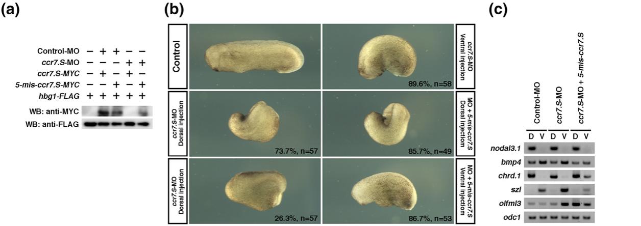 (b) Phenotypes of embryos injected with ccr7.S-MO. Dorsal gastrulation defects, 73.7% (n = 57). Head defects, 26.3%