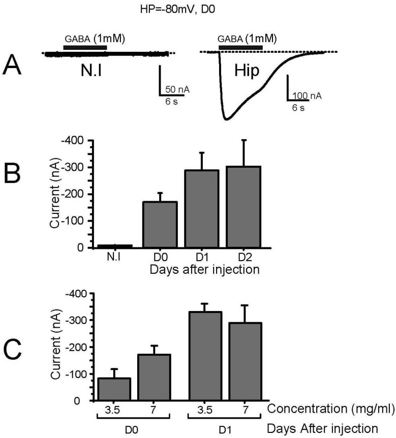 Figure 1. Kinetic of receptor expression after injection of membrane preparation. (A) Typical current traces recorded in response to perfusion of GABA (1 mM) of control oocytes (N.I.) or oocytes injected with hippocampal brain membrane preparation (Hip), 6 h after injection (D0). (B) Kinetics of the response to GABA of oocytes injected with hippocampal brain membrane preparation quantified as the peak current amplitude recorded in response to GABA application (1 mM, HP = −80 mV, EC50 = 81µM) at D0: 6 h after membrane injection, and D1 and D2: 24 and 48 h after membrane injection, respectively. (C) Effect of injected hippocampal membrane concentration on the amplitude of the response of the oocytes to the perfusion of GABA. Two concentrations were used (3.5 and 7 mg/mL) and two time points were analyzed (D0 and D1).