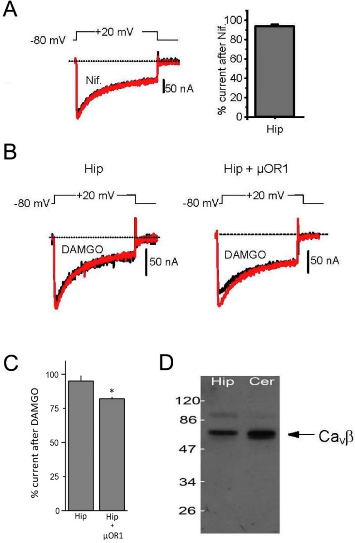 Figure 4. Pharmacology of the transplanted voltage-gated Ca2+ channels. (A) Typical response of a hippocampal membrane-injected oocyte to 10 µM nifedipine. Voltage-gated Ca2+ currents were recorded during 400 ms-long depolarizations from −80 mV to +20 mV in the presence of 40 mM Ba2+. Right: histogram showing the average response to nifedipine. (B) Response of transplanted voltage-gated Ca2+ channels to the µ-opioid agonist DAMGO (10 µM). Oocytes were injected with hippocampal membrane preparation, and were re-injected 24 h later with either H2O (Hip) or the µ1 opiod receptor RNA at 1 ug/uL (Hip + µOR1). Recordings were made 48 h after the hippocampal membrane injection. (C) Average response to 10 µM DAMGO of transplanted voltage-gated Ca2+ channels co-injected or not with the µ1 opioid receptor RNA (D). Western blot using either hippocampal (Hip) or cerebellum (Cer) membrane preparations and probed with an anti-CaVβcom antibody showed that, in both cases, the cytoplasmic voltage-gated Ca channel auxiliary subunits, CaVβ, remained associated with the channel subunit(s). *—with injection.