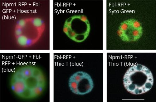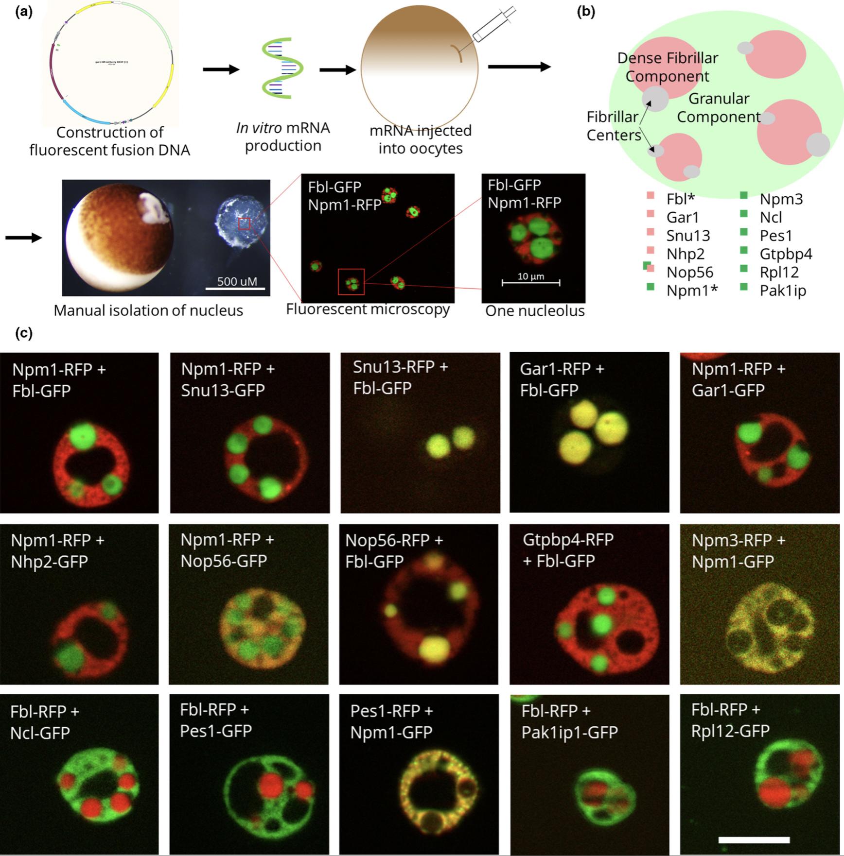 FIGURE 1. Fluorescent fusion protein nucleolar localization. (a) Schematic of fluorescent fusion protein expression within Xenopus laevis oocyte nucleoli, showing the expression of the canonical domain markers Npm1 (fused with RFP) and Fbl (fused with GFP). (b) Model of the localization of each of these proteins. *Canonical domain markers. (c) Images of representative nucleoli with the labeled fluorescent fusion expressed with either Npm1 or Fbl, the canonical domain markers for the granular component and the dense fibrillar component, respectively. Scale bar = 10 μm |