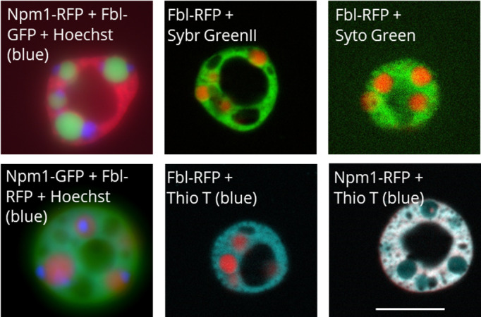Figure 2. Representative images of Hoechst 33342, Sybr Green II, Syto Green, and Thioflavin T nucleolar staining as indicated by the label on each image. The Hoechst images are whole field fluorescence images, while all other images are apotome section fluorescence images. Scale bar = 10 μm |