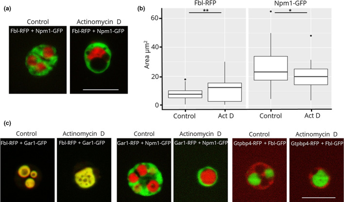FIGURE 5. (a) Fluorescence microscopy images of actinomycin D treatment of nucleoli from oocytes injected with Fbl‐RFP and Npm1‐GFP. (b) Quantification of the area occupied by Fbl and Npm1 before and after actinomycin D treatment. (c) Representative images of actinomycin D‐treated Fbl‐RFP/Gar1‐GFP, Gar1‐mCherry/Npm1‐GFP, and Gtpbp4‐mCherry/Fbl‐GFP. Scale bar = 10 μm |