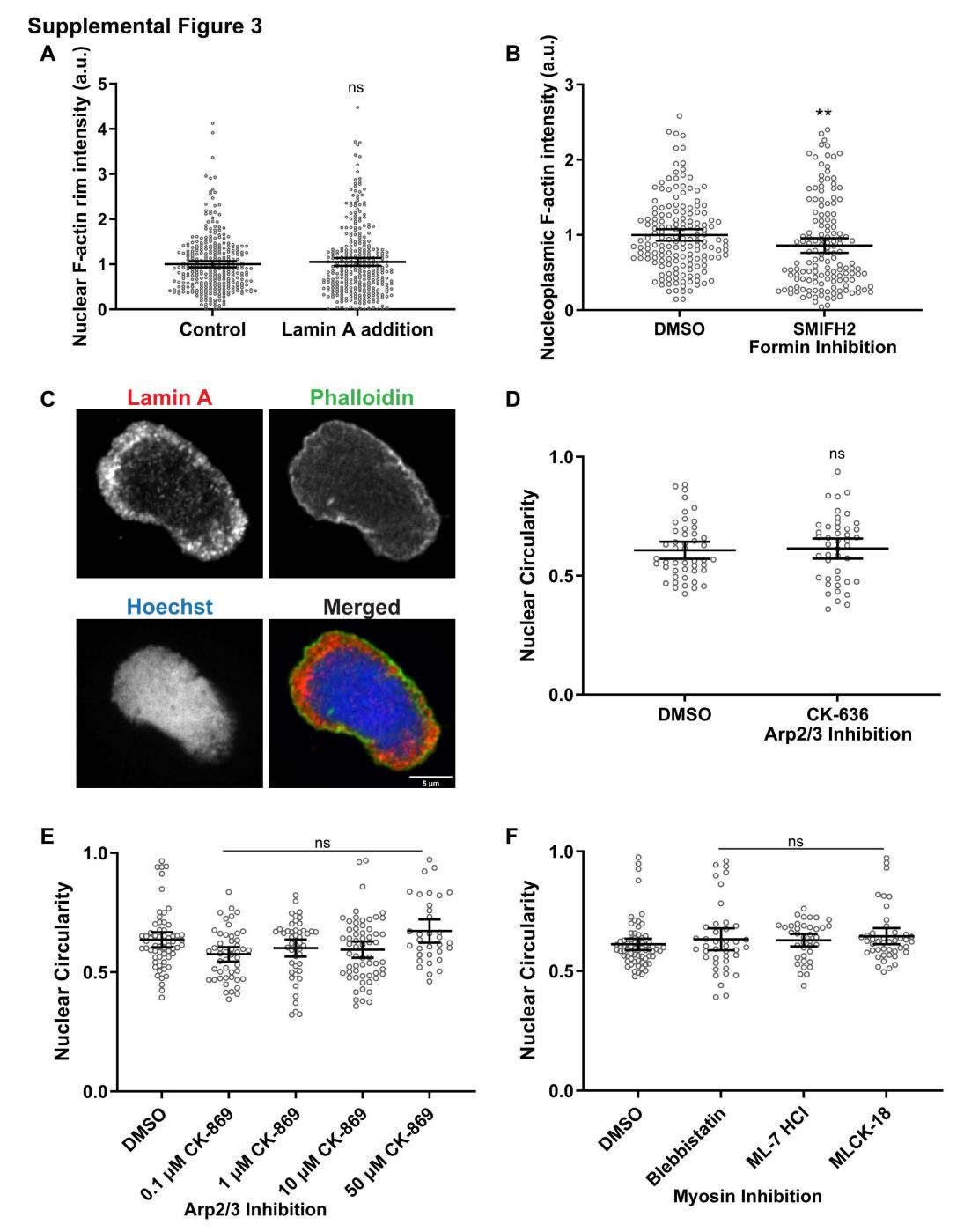 Fig. S3. Lamin A localization and inhibition of actin regulators in F-actin intact Xenopus egg extracts. (A) Experiments were performed as in Figure 4. F-actin at the nuclear rim was quantified based on LifeAct-GFP signal intensity from widefield microscopy images. Data are from 4 independent experiments with 320 nuclei for control and 322 nuclei for Lamin A addition. (B) Experiments were performed as in Figure 6. Nucleoplasmic F-actin intensity was measured based on LifeAct-GFP signal within the nucleoplasm (excluding rim signal) from widefield microscopy images. Based on 3 independent experiments, 160 DMSO nuclei and 145 SMIFH2 nuclei were quantified. (C) Experiments were performed as in Figure 4. For extracts supplemented with recombinant Lamin A, nuclei were fixed, spun down onto coverslips, and stained for His-tagged Lamin A (red), Phalloidin (green), and Hoechst (blue). Representative confocal microscopy images are shown. (D) Experiments were performed as in Figure 1 with F-actin intact extract except that 200 µM of Arp2/3 inhibitor CK-636 was added after 45 minutes of nuclear assembly. Nuclear circularity was measured for 47 DMSO nuclei and 44 CK-636 nuclei. (E) Experiments were performed as in Figure 1 with F-actin intact extract except that the indicated concentrations of Arp2/3 inhibitor CK-869 were added after 45 minutes of nuclear assembly. Nuclear circularity was measured for 62 DMSO nuclei, 49 CK-869 (0.1 µM) nuclei, 47 CK-869 (1 µM) nuclei, 61 CK-869 (10 µM) nuclei, and 33 CK-869 (50 µM) nuclei. (F) Experiments were performed as in Figure 1 with F-actin intact extract except that 100 µM of the indicated myosin inhibitors was added after 45 minutes of nuclear assembly. Nuclear circularity was measured for 69 DMSO nuclei, 41 Blebbistatin nuclei, 38 ML-7 HCl nuclei, and 44 MLCK-18 nuclei. Mean values and 95% CI error bars are shown. Nonparametric Mann-Whitney tests were performed in (A), (B), and (D). Nonparametric Kruskall-Wallis tests were performed in (E) a nd (F). Statistical significance is shown relative to DMSO controls. P>0.05 ns, Pâ¤0.01 **. |