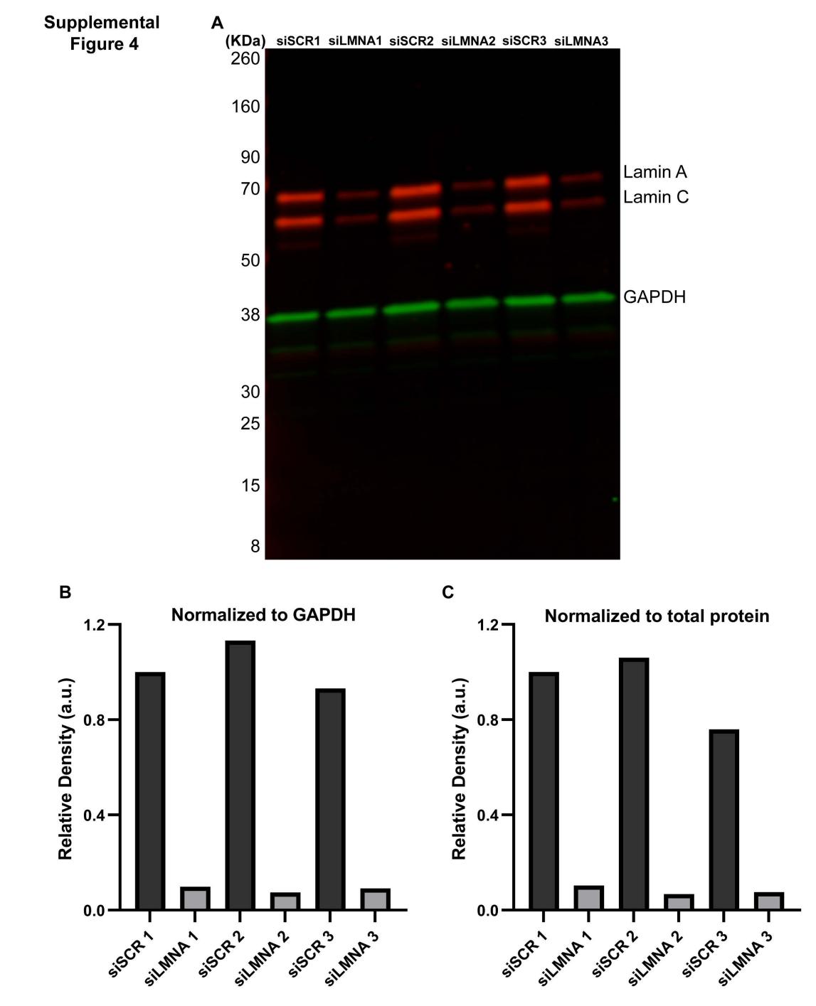 Fig. S4. Confirmation of Lamin A/C knockdown in HeLa cells. (A) HeLa cells were transfected with a scrambled control (siSCR) or siRNA targeted against Lamin A/C (siLMNA). Cell lysates were subjected to western blot analysis, probing for Lamin A/C and GAPDH as a loading control. The numbers refer to three different replicates. (B) Lamin A/C band intensity was normalized to GAPDH band intensity for each sample. (C) Blots were stained with Ponceau to detect total protein. Lamin A/C band intensity was normalized to total protein band intensity for each sample. |