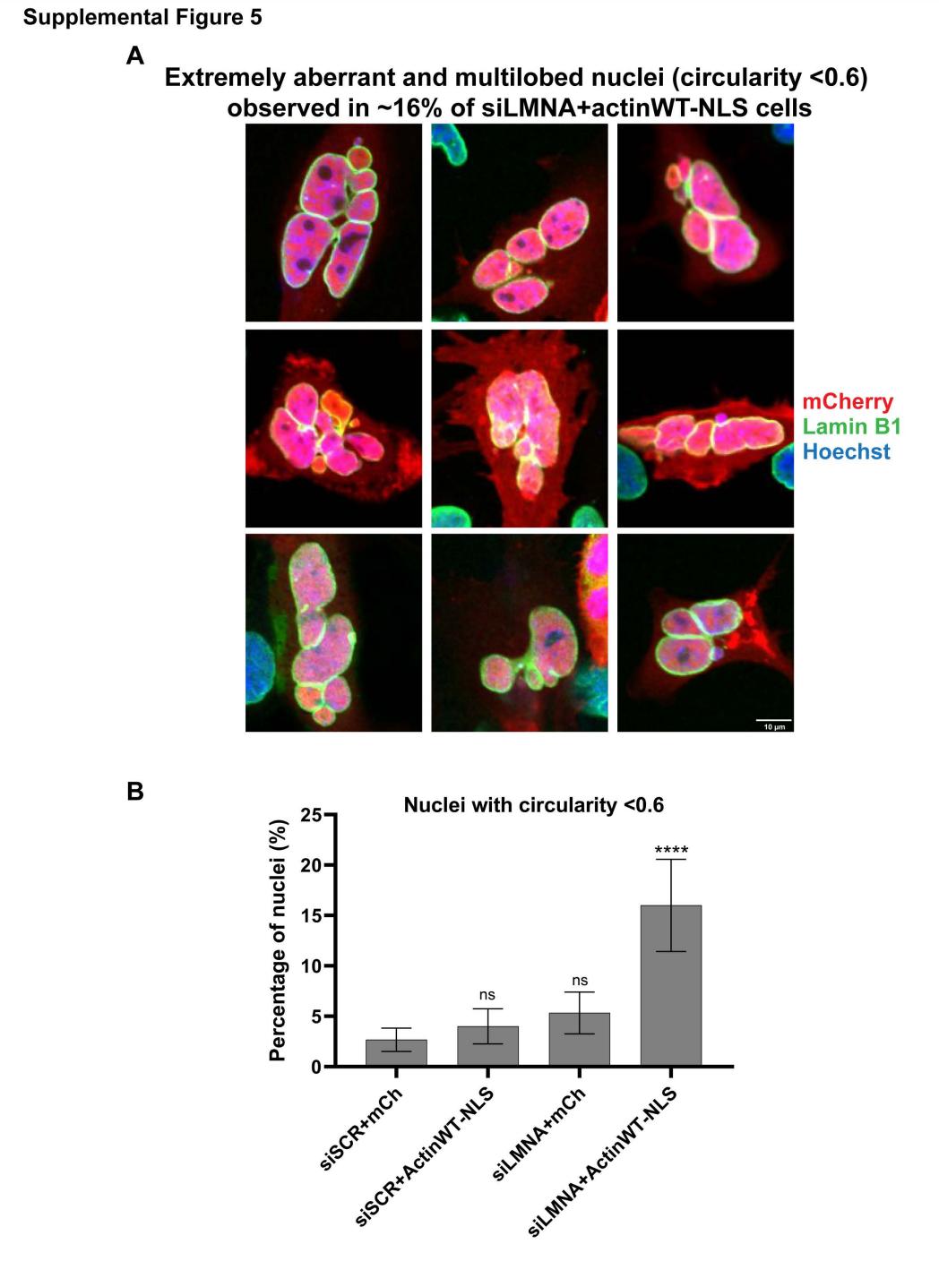 Fig. S5. Extreme nuclear morphology phenotypes in HeLa cells. (A) Experiments were performed as described in Figure 5A. In ~16% of transfected Lamin A knockdown cells expressing nuclear-targeted actin, extremely aberrant or multilobed nuclei were observed (circularity below 0.6). (B) Based on the data presented in Fig. 5A-B, the percentage of extremely aberrant or multilobed nuclei (circularity below 0.6) was calculated for each condition based on 3 independent experiments. Mean values and SD error bars are shown: siSCR+mCh (2.7%±1.2%), siSCR+actinWT-NLS (4.0%±1.7%), siLMNA+mCh (5.3%±2.1%), and siLMNA+actinWT-NLS (16.0%±4.6%). Statistical significance relative to siSCR+mCh was assessed by contingency Chi-square tests. P>0.05 ns, P≤0.0001 ****. |