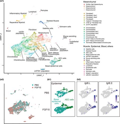 FIGURE 1. Single‐cell transcriptomics on the FGF10‐treated and PBS‐treated hindlimb blastemas. (a1‐2) UMAP plot of cells detected in the scRNA‐seq. (a1) cells from the FGF10‐treated and PBS‐treated samples were combined and divided into 35 clusters depending on the similarity of the gene expression profiles in each cell. Colors indicate cluster identity. Expression profiles of several marker genes in each cluster are shown in Figure S2. (a2) UMAP plot with colors indicating sample condition. (b1‐2) The scRNA‐seq data showed expansion of the AEC cluster and fgf8‐expressing cells in the FGF10‐treated sample. (b1) UMAP plot of the AEC and basal epidermal cell clusters of the PBS‐treated (top) and FGF10‐treated (bottom) samples. (b2) Normalized expression levels (transcripts per 104) of fgf8.L and fgf8.S in the epidermal clusters of each cell of the PBS‐treated (top) and FGF10‐treated (bottom) samples are plotted in natural‐log transformed scale shown by color depth of blue