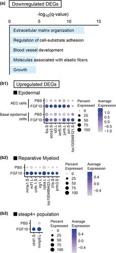 FIGURE 2. Effect of FGF10 treatment on gene expression profiles of each cluster. (a) Mouse orthologs of all the downregulated DEGs (Fc <0.5) detected in each cluster were searched, and the identified mouse orthologs were subjected to enrichment analysis. The terms with the five lowest q‐values in the enrichment analysis are shown. (b1–3) Comparison of the expression levels of upregulated DEGs (Fc >2) detected in the epidermal (b1), reparative myeloid (b2), and steap4+ population (b3) clusters between PBS‐treated and FGF10‐treated conditions. Average expression level is shown as z‐score (quotient of the difference between the mean expression value of cells in the cluster and the mean expression value of all cells, and the standard deviation of expression of all cells) calculated with the mean expression value of cells in indicated clusters of each condition (PBS or FGF10) and of both conditions, indicated by dot color depth. Percentage of expressing cells in each cluster is indicated by dot size. Mouse orthologs of loc100049121.S in (b1) and loc100489423.L in (b2) are cystatin B (cstb) and toll‐like receptor 5 (tlr5), respectively