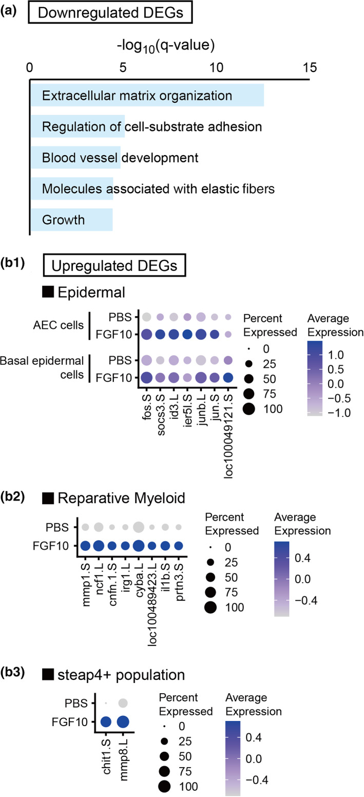 Figure 2. Effect of FGF10 treatment on gene expression profiles of each cluster. (a) Mouse orthologs of all the downregulated DEGs (Fc <0.5) detected in each cluster were searched, and the identified mouse orthologs were subjected to enrichment analysis. The terms with the five lowest q-values in the enrichment analysis are shown. (b1â3) Comparison of the expression levels of upregulated DEGs (Fc >2) detected in the epidermal (b1), reparative myeloid (b2), and steap4+ population (b3) clusters between PBS-treated and FGF10-treated conditions. Average expression level is shown as z-score (quotient of the difference between the mean expression value of cells in the cluster and the mean expression value of all cells, and the standard deviation of expression of all cells) calculated with the mean expression value of cells in indicated clusters of each condition (PBS or FGF10) and of both conditions, indicated by dot color depth. Percentage of expressing cells in each cluster is indicated by dot size. Mouse orthologs of loc100049121.S in (b1) and loc100489423.L in (b2) are cystatin B (cstb) and toll-like receptor 5 (tlr5), respectively.