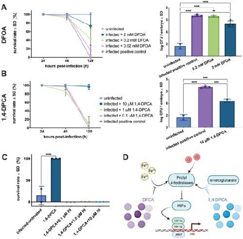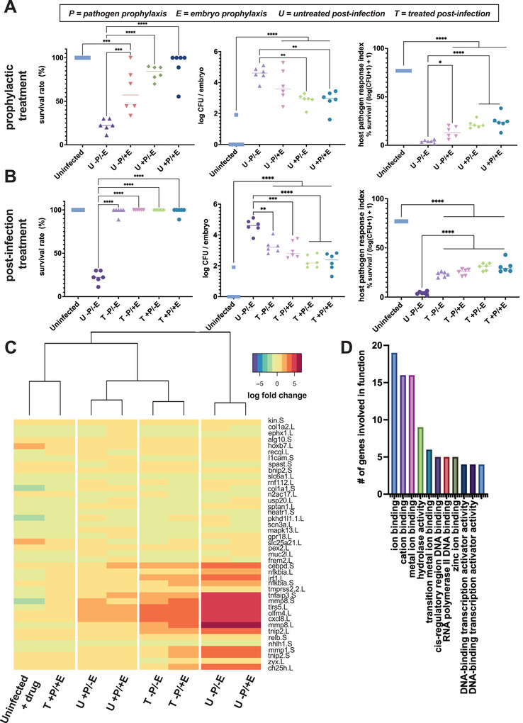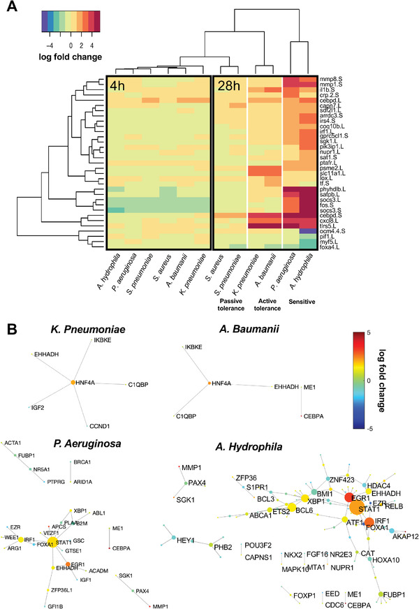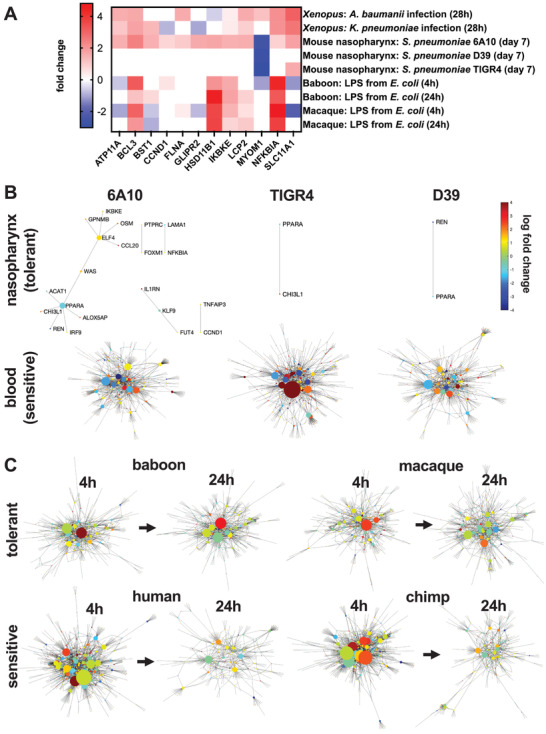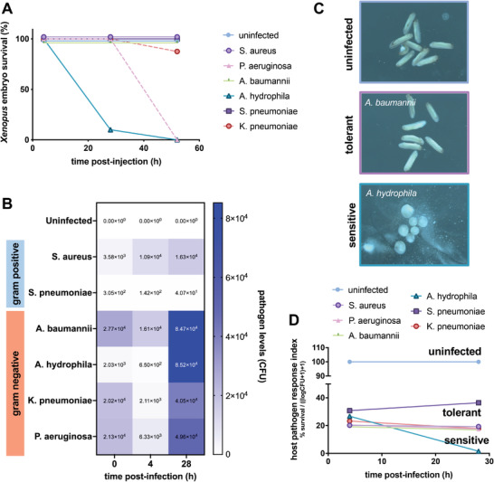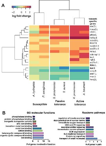 Current therapeutic strategies against bacterial infections focus on reduction of pathogen load using antibiotics; however, stimulation of host tolerance to infection in the presence of pathogens might offer an alternative approach. Computational transcriptomics and Xenopus laevis embryos are used to discover infection response pathways, identify potential tolerance inducer drugs, and validate their ability to induce broad tolerance. Xenopus exhibits natural tolerance to Acinetobacter baumanii, Klebsiella pneumoniae, Staphylococcus aureus, and Streptococcus pneumoniae bacteria, whereas Aeromonas hydrophila and Pseudomonas aeruginosa produce lethal infections. Transcriptional profiling leads to definition of a 20-gene signature that discriminates between tolerant and susceptible states, as well as identification of a more active tolerance response to gram negative compared to gram positive bacteria. Gene pathways associated with active tolerance in Xenopus, including some involved in metal ion binding and hypoxia, are found to be conserved across species, including mammals, and administration of a metal chelator (deferoxamine) or a HIF-1α agonist (1,4-DPCA) in embryos infected with lethal A. hydrophila increased survival despite high pathogen load. These data demonstrate the value of combining the Xenopus embryo infection model with computational multiomics analyses for mechanistic discovery and drug repurposing to induce host tolerance to bacterial infections.