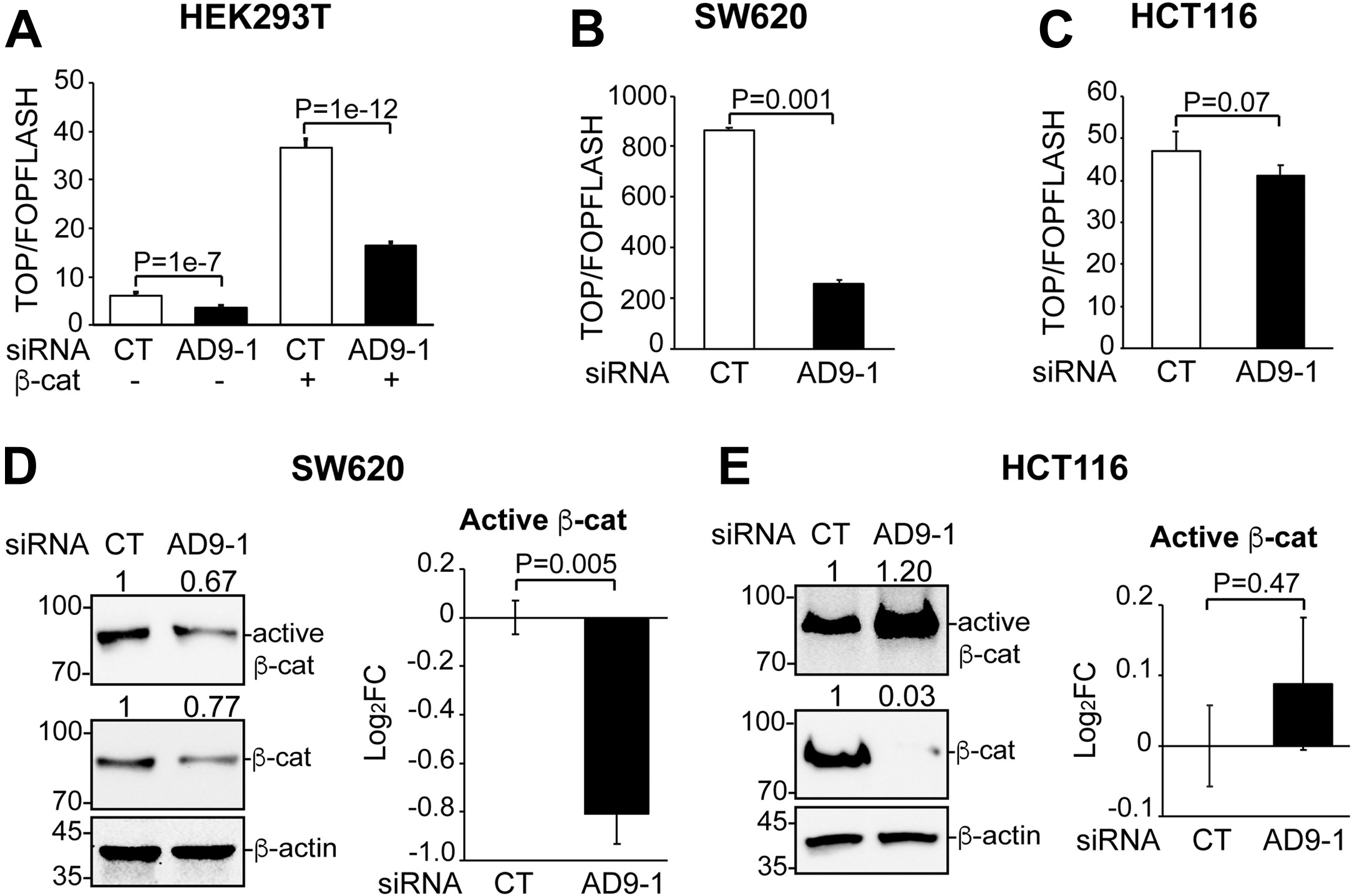 Figure 3. KD of ADAM9 inhibits Wnt activity in HEK293T and SW620 but not HCT116 cells. Cells were transfected with the indicated siRNA and plasmid. A-C, TOP/FOPFLASH luciferase reporter assays were carried out in triplicate with the indicated cell lines, and unpaired t tests were performed to compare Wnt activity. Error bars represent SD. D and E, Western blotting was carried out for cell lysates with the antibodies for total and active β-catenin, as indicated, in SW620 (D) or HCT116 (E) cells. Western blotting was repeated in triplicate to confirm the effects of ADAM9 KD on active β-catenin (see Fig. S3 for images of blots); unpaired t tests were performed for log2FC of protein levels and summarized in graphs (error bars represent SEM). ADAM, A Disintegrin and Metalloprotease; KD, knockdown. |