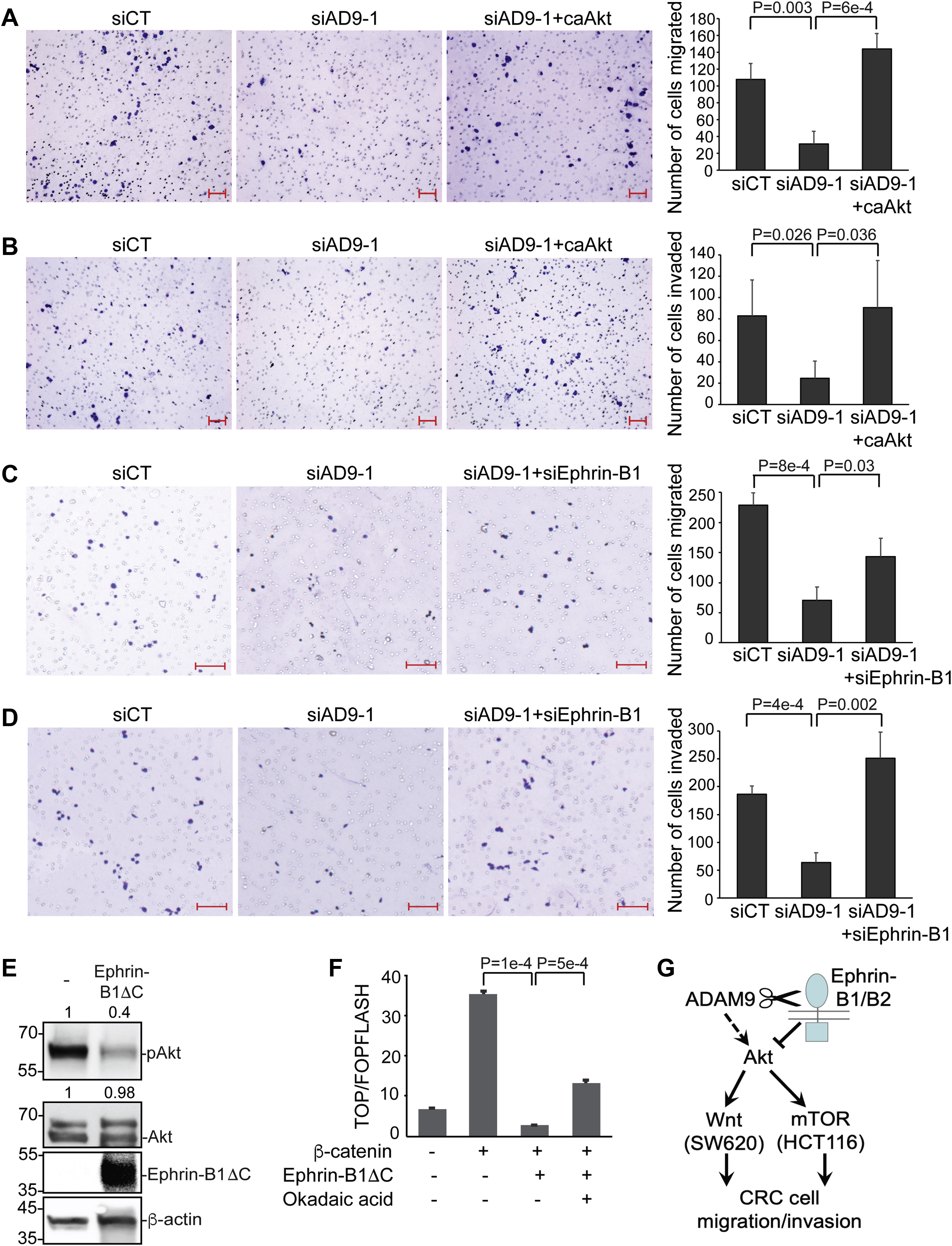Figure 5. ADAM9 activates Akt, possibly via the ephrin-BâPP2A axis, to promote CRC cell migration and invasion. A-D, SW620 cells were transfected with the indicated siRNA and plasmid, and transwell migration (A and C) and invasion (B and D) assays were performed in triplicate. E, HCT116 cells were transfected with empty vector or a plasmid encoding HA-tagged ephrin-B1ÎC, and Western blotting was carried out using the indicated antibodies (anti-HA for ephrin-B1ÎC). F, HEK293T cells were transfected with the indicated plasmids and treated with 1 μM okadaic acid, and TOP/FOPFLASH assays were carried out for cell lysates obtained for three biological replicates. G, a model for ADAM9 function in CRC migration and invasion. Unpaired t tests were performed in A-D and F; error bars represent SD. The scale bars represent 100 μm. ADAM, A Disintegrin and Metalloprotease; CRC, colorectal cancer; PP2A, protein phosphatase 2A. |