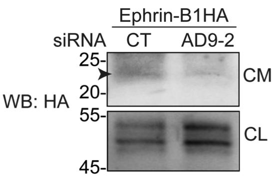 Figure S1 Transfection of HCT116 cells with siAD9-2 inhibits ephrin-B1 shedding. HCT116 cells were transfected with a plasmid encoding N-terminally HA-tagged ephrin-B1 with siControl (CT) or siAD9-2, and western blotting was carried out for conditioned media (CM) or cell lysates (CL) using an anti-HA antibody. |