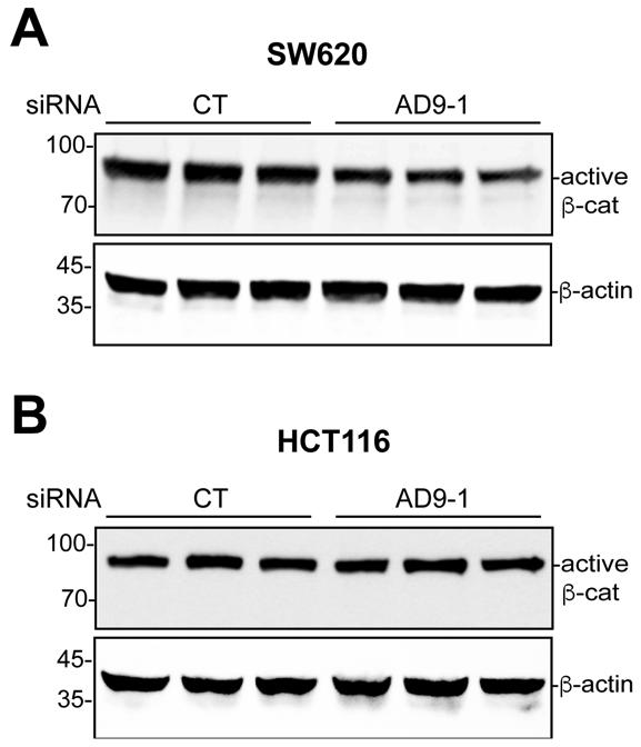 Figure S3 KD of ADAM9 reduces active b-catenin in SW620 but not HCT116 cells. SW620 (A) and HCT116 (B) cells were transfected with the indicated siRNA, and western blotting was performed for cell lysates using the indicated antibodies. Experiments were carried out in triplicate, and statistics are presented in Fig. 3D and E, respectively. |