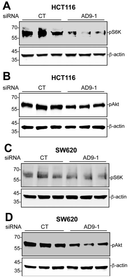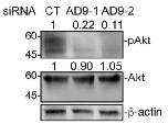 Figure S5 Transfection of HCT116 cells with either siAD9-1 or siAD9-2 inhibits Akt activity. HCT116 cells were transfected with the indicated siRNA, and western blotting was carried out for cell lysates using the indicated antibodies. |