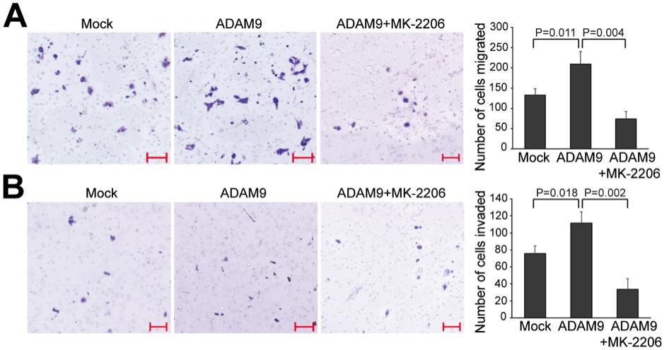 Figure S6 Overexpression of ADAM9 in HCT116 cells leads to increased migration and invasion, which can be blocked by Akt inhibition. HCT116 cells were transfected with empty pCS2+ vector (Mock) or pCS2+:Adam9, and treated with DMSO (vehicle control) or 12.5 nM of the selective Akt inhibitor MK-2206. Transwell migration (A) and invasion (B) assays were carried out. Results of 3 biological replicates for each treatment are summarized on the right, and unpaired t test was performed. Error bars represent standard deviation. Scale bars, 100 μm. |