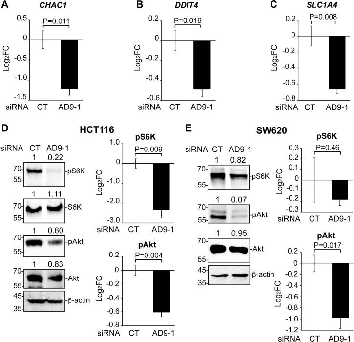 Figure 4. KD of ADAM9 inhibits Akt activity but differentially affects mTOR signaling in HCT116 and SW620 cells. A-C, HCT116 cells were transfected with control or AD9-1 siRNA, and RT-qPCR was carried out for the indicated genes in three biological replicates. D and E, Western blotting was carried out for cell lysates with the antibodies for the indicated proteins in HCT116 (D) or SW620 (E) cells transfected with control or AD9-1 siRNA. Western blotting was repeated in triplicate to confirm the effects of ADAM9 KD on phospho-S6K and phosphor-Ser473 Akt (see Fig. S4 for images of blots); unpaired t tests were performed for log2FC of protein levels and summarized in graphs (error bars represent SEM). ADAM, A Disintegrin and Metalloprotease; KD, knockdown; RT-qPCR, quantitative RT-PCR. |