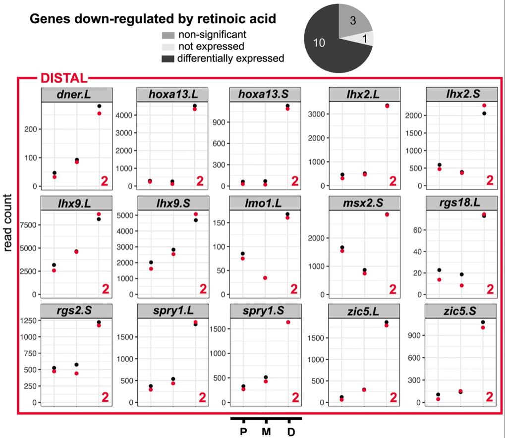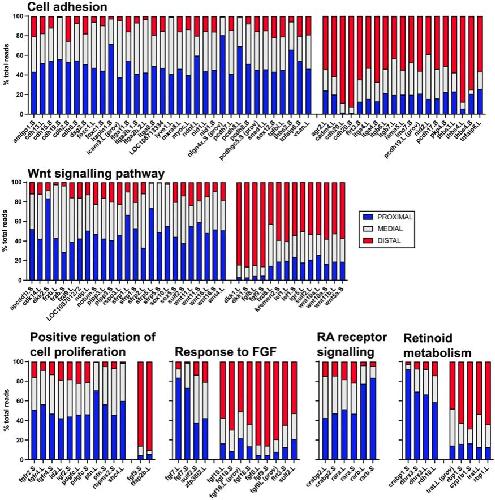 Genes referenced: aldh1a2 anos1 apcdd1l b3gnt7 capn8 capn8.3 col6a6 cyp26b1 dhrs3 dkk1 dner ednra epha7 fam83c fgf8 fibin flrt2 gata5 hoxa13 htra3 irx5 lhx2 lhx9 lmo1 meis1 msx2 pamr1 papln pbx1 rbp1 rbpms rgs18 rgs2 rhbg rnd3 sall1 serpinf1 spry1 sptbn1 sytl2 tll2 tnn zic5