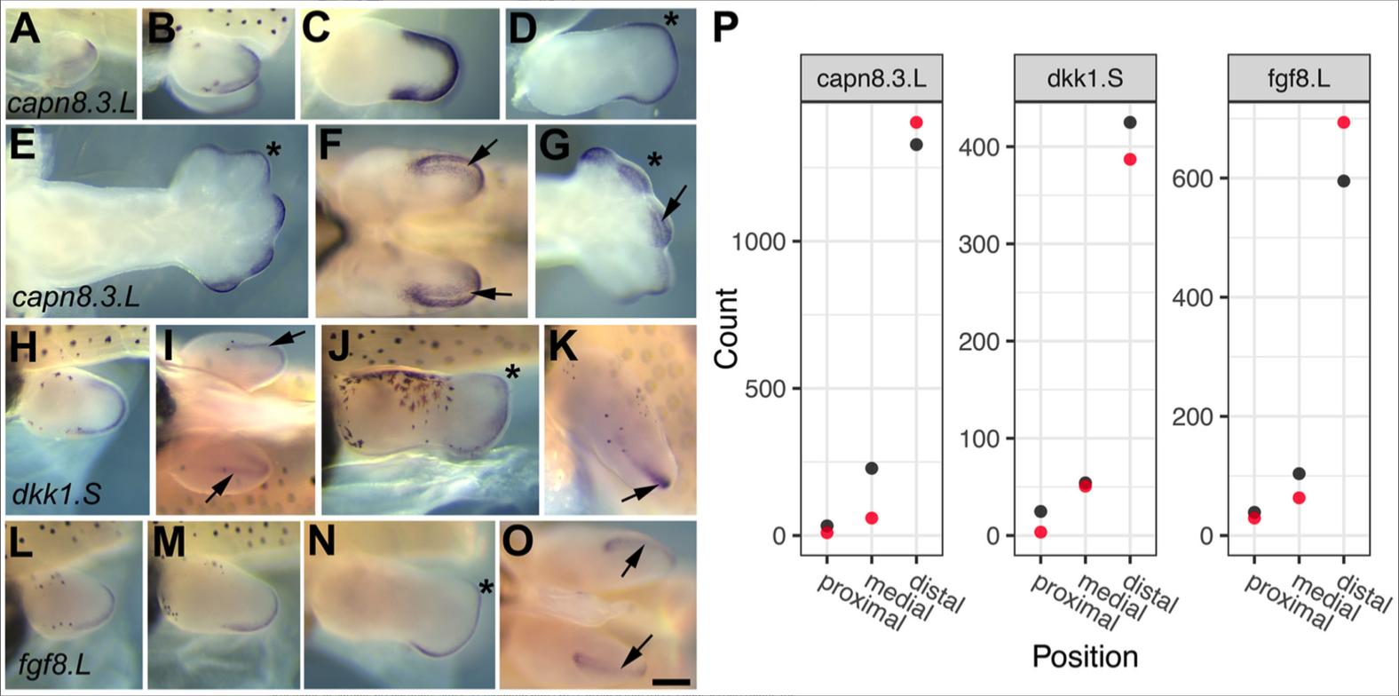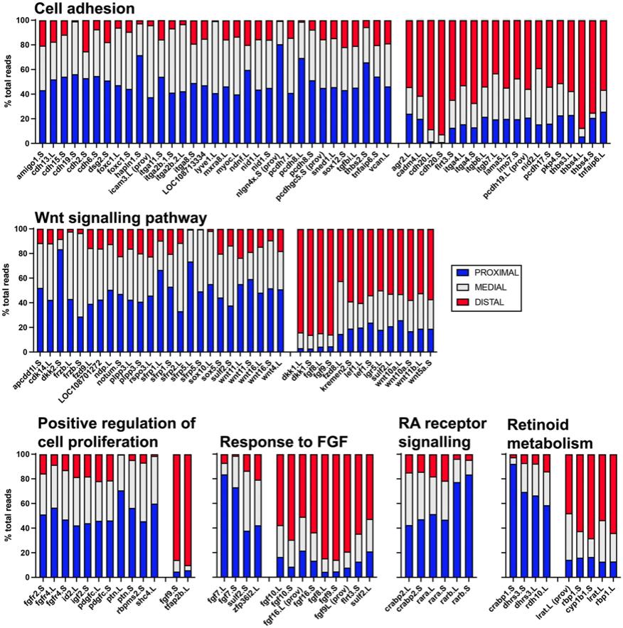 BACKGROUND: Limb buds develop as bilateral outgrowths of the lateral plate mesoderm and are patterned along three axes. Current models of proximal to distal patterning of early amniote limb buds suggest that two signals, a distal organizing signal from the apical epithelial ridge (AER, Fgfs) and an opposing proximal (retinoic acid [RA]) act early on pattern this axis. RESULTS: Transcriptional analysis of stage 51 Xenopus laevis hindlimb buds sectioned along the proximal-distal axis showed that the distal region is distinct from the rest of the limb. Expression of capn8.3, a novel calpain, was located in cells immediately flanking the AER. The Wnt antagonist Dkk1 was AER-specific in Xenopus limbs. Two transcription factors, sall1 and zic5, were expressed in distal mesenchyme. Zic5 has no described association with limb development. We also describe expression of two proximal genes, gata5 and tnn, not previously associated with limb development. Differentially expressed genes were associated with Fgf, Wnt, and RA signaling as well as differential cell adhesion and proliferation. CONCLUSIONS: We identify new candidate genes for early proximodistal limb patterning. Our analysis of RA-regulated genes supports a role for transient RA gradients in early limb bud in proximal-to-distal patterning in this anamniote model organism.