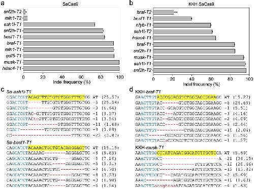 Figure 2. SaCas9 and KKH SaCas9 are efficient and robust tools for genome editing in X. tropicalis. a SaCas9 induced efficient targeted gene disruption in X. tropicalis embryos. b KKH SaCas9 induced efficient targeted gene disruption in X. tropicalis embryos. c, d Deep-sequencing data show some of the mutations induced by SaCas9 and KKH SaCas9. For all the panels, the wild-type sequence is shown at the top with the target site highlighted in yellow and the PAM sequence in blue text. Red dashes indicate deletions and lowercase letters in red indicate insertions or mutations. The numbers in parentheses show the percentage of this sequence in the total sequence reads. For target site designation, the gene name is in the middle, the prefixes Sa- and KKH- represent SaCas9 and KKH SaCas9, respectively. The suffixes -T1 and -T2 represent the first and the second target site designed in a given gene, respectively |