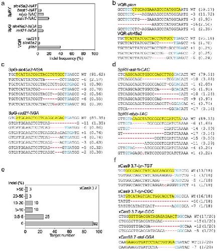 Figure 3. VQR Cas9, SpG Cas9, SpRY Cas9 and xCas9 3.7 have limited genome editing efficacy in X. tropicalis. a VQR Cas9, SpG Cas9, and SpRY Cas9 induced indel frequency in X. tropicalis embryos, as detected by deep-sequencing. bâd Some of the deep-sequencing data show the mutations induced by VQR Cas9, SpG Cas9, and SpRY Cas9. The wild-type sequence is shown at the top with the target site highlighted in yellow and the PAM sequence in blue text. Red dashes indicate deletions and lowercase letters in red indicate insertions or mutations. For all panels, the numbers in parentheses show the percentage of this sequence in the total sequence reads. e Summary of the xCas9 3.7 targeted genome-editing efficiency based on gray value analyses of the T7EI data. f DNA sequences show xCas9 3.7 induced mutations, as detected by Sanger DNA sequencing. For each panel, the wild-type sequence is shown at the top with the target site highlighted in yellow and the PAM sequence in blue text. Red dashes indicate deletions and lowercase letters in red indicate insertions or mutations. The numbers in parentheses represent the ratio of this sequence in the total colonies sequenced. For target site designation, in addition to the gene name, the name of the Cas9 variant is used as a prefix and in some cases the PAM motif is indicated as a suffix |