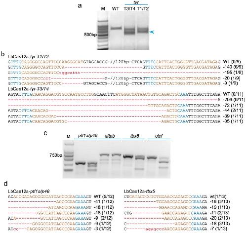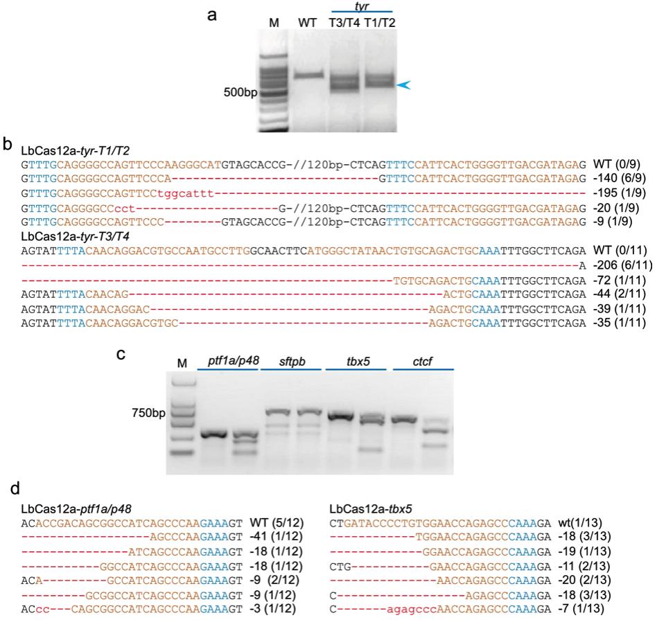 Figure 4. LbCas12a/crRNA RNP complex is an efficient and robust tool for short DNA fragment deletion and targeted gene disruption in X. tropicalis. a PCR assay data show segmental deletions induced by LbCas12a/crRNA RNP complex with paired crRNAs at the tyr locus of X. tropicalis embryos. M, DNA molecular weight marker. crRNAs T1 pairs with T2 and T3 pairs with T4. b Sanger DNA sequencing data show segmental deletions as well as indels induced by LbCas12a/crRNA RNP complex with paired crRNAs at the tyr locus. For both panels, the wild-type sequence is shown at the top with the target sites in red and the PAM sequence in blue. In the upper panel, 120 bp wild-type sequences were not shown. Red dashes indicate deletions and lowercase letters in red indicate insertions or mutations. The numbers in parentheses represent the ratio of this sequence in the total colonies sequenced. c T7EI assay data show targeted mutations induced by ptf1a/p48, sftpb, tbx5, or ctcf crRNAs and the LbCas12a RNP complexes. M, DNA molecular weight marker. d Sanger DNA sequencing data show targeted mutations induced by ptf1a/p48, or tbx5 crRNAs and the LbCas12a RNP complexes. For both panels, the wild-type sequence is shown at the top with the target sites in red and the PAM sequence in blue. Red dashes indicate deletions and lowercase letters in red indicate mutations. The numbers in parentheses indicate the ratio of this sequence in the total colonies sequenced |