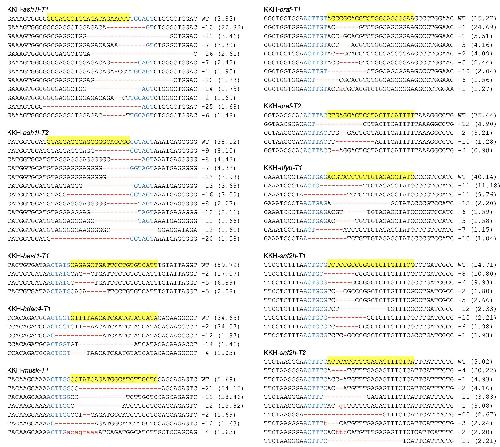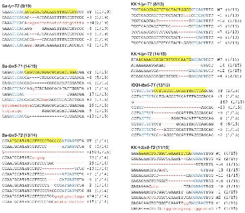 Fig. S9. Sanger DNA sequencing data show the mutations induced by SaCas9 and KKH SaCas9 targeting the genes showed in Fig. 5. For all the panels, the wild-type sequence is shown at the top with the target site highlighted in yellow and the PAM sequence in blue text. Red dashes indicate deletions and lowercase letters in red indicate insertions or mutations. The numbers in parentheses indicate ratio of this sequence in the total colonies sequenced. For target site designation, the gene name is in the middle, the prefixes Sa- and KKH- represent SaCas9 and KKH SaCas9, respectively. The suffixes -T1 and -T2 represent the first and the second target site designed in a given gene, respectively. |