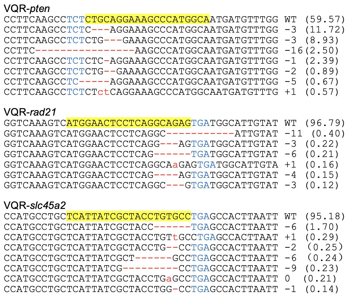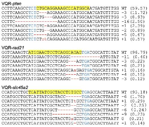 Fig. S4. DNA deep-sequencing data show the mutations induced by VQR Cas9 targeting the genes showed in Fig. 3a. For all the panels, the wild-type sequence is shown at the top with the target site highlighted in yellow and the PAM sequence in blue text. Red dashes indicate deletions and lowercase letters in red indicate insertions or mutations. The numbers in parentheses show the percentage of this sequence in total sequencing reads. |