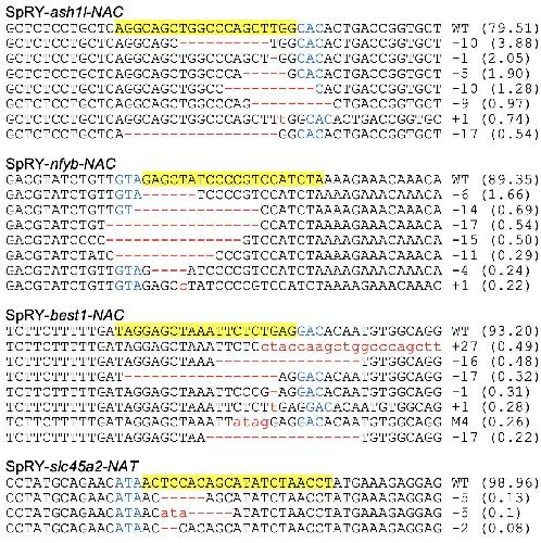 Fig. S6. DNA deep-sequencing data show the mutations induced by SpRY Cas9 targeting the genes showed in Fig. 3a. For all the panels, the wild-type sequence is shown at the top with the target site highlighted in yellow and the PAM sequence in blue text. Red dashes indicate deletions and lowercase letters in red indicate insertions or mutations. The numbers in parentheses show the percentage of this sequence in total sequencing reads. For target site designation, in addition to the gene name, the name of the Cas9 variant is used as a prefix and the PAM motif is indicated as a suffix. |