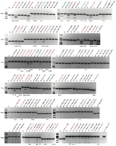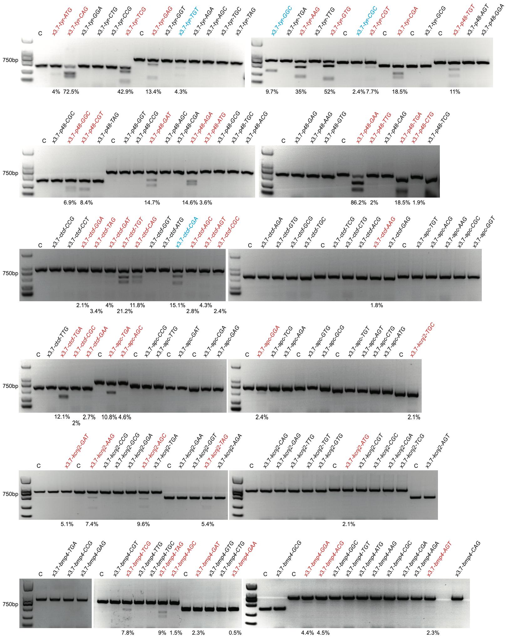 Fig. S7. T7EI assay data show the mutagenic activities of xCas9 3.7 targeting non-NGG PAM sites in X. tropicalis embryos. The targeting sites labelled in red and blue are the effective ones with their effective gray values indicated at the bottom. The blue ones have been further verified by Sanger DNA sequencing. C, control. For target site designation, in addition to the gene name, the name of the Cas9 variant is used as a prefix and the PAM motif is indicated as a suffix. |