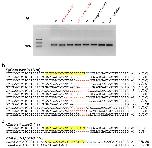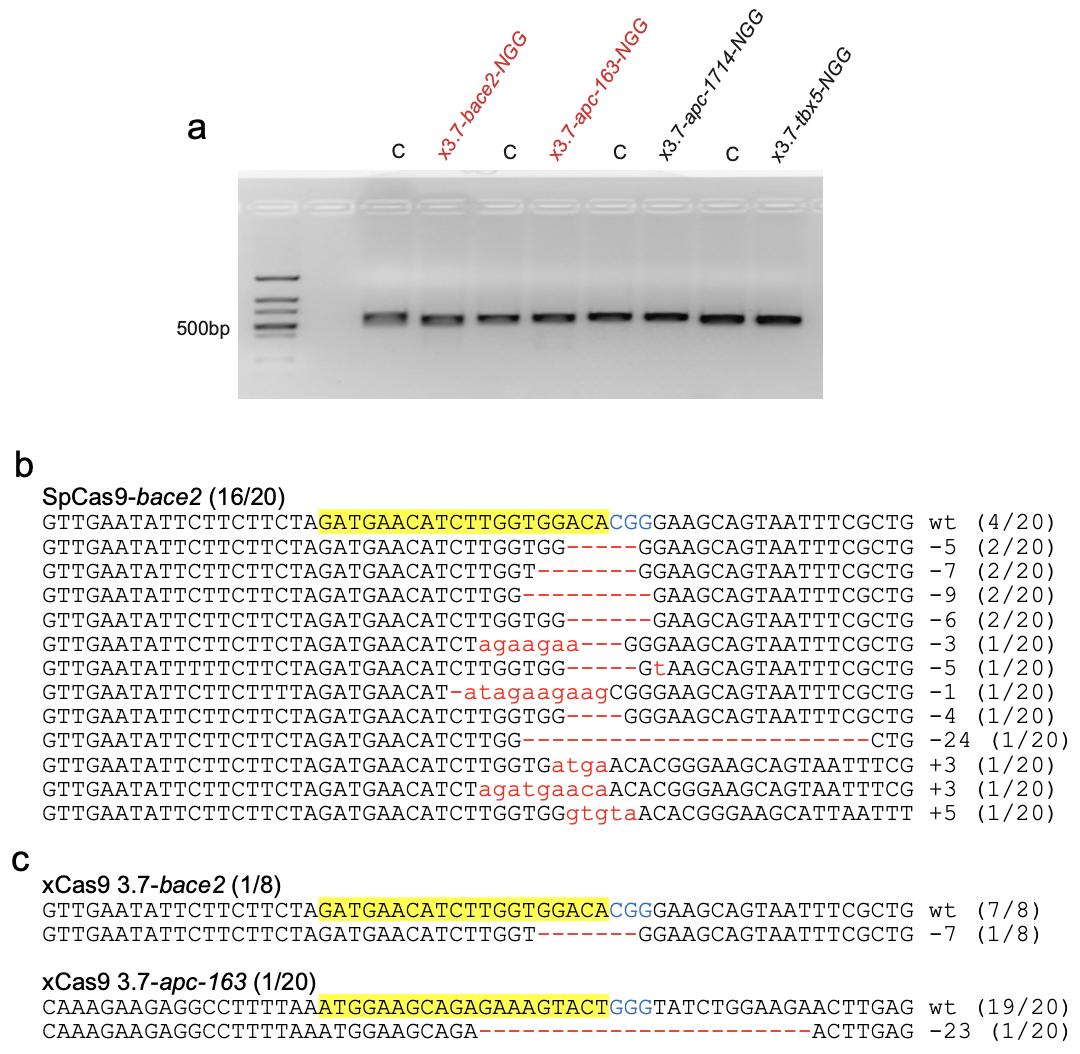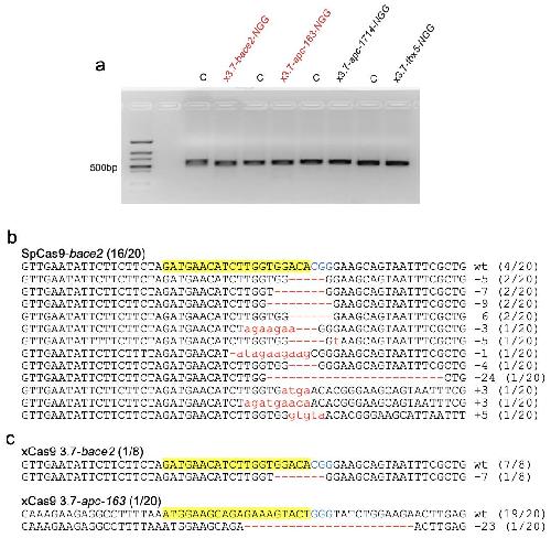 Fig. S8. NGG xCas9 3.7 is ineffective in X. tropicalis embryos. (a) T7EI assay data show the mutagenic activities of xCas9 3.7 targeting NGG PAM sites in X. tropicalis embryos. The targeting sites labelled in red have been further verified by Sanger DNA sequencing shown in c. C, control. (b) Sanger DNA sequencing data show the mutations of bace2 induced by SpCas9. (c) The upper panel shows the Sanger DNA sequencing data of the bace2 mutation induced by xCas9 3.7 targeting exactly the same site shown in b. The lower panel shows the Sanger DNA sequencing data for xCas9 3.7-apc-163 site. For all the panels in b and c, the wild-type sequence is shown at the top with the target site highlighted in yellow and the PAM sequence in blue text. Red dashes indicate deletions and lowercase letters in red indicate insertions or mutations. The numbers in parentheses represent the ratio of this sequence in the total colonies sequenced. |