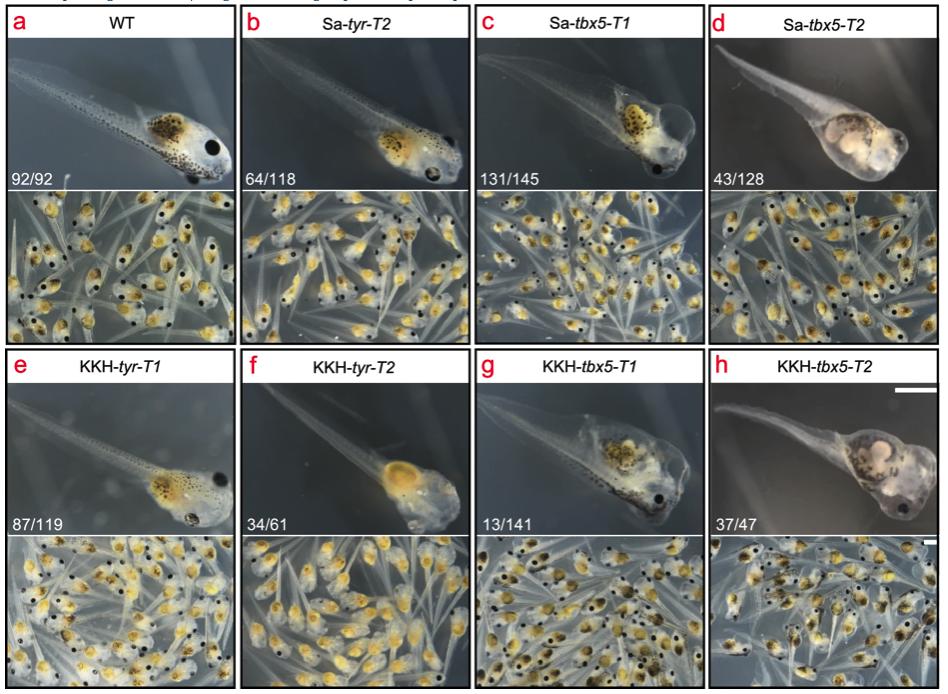 Figure 5. SaCas9 and KKH SaCas9 mediated genome editing are efficient enough for G0 phenotyping in X. tropicalis. a Wild-type stage 44 tadpoles. b Stage 44 tadpoles show minor perturbation of cutaneous and ocular pigmentation upon SaCas9-mediated disruption of tyr. c, d Stage 44 tadpoles show cardiac malformation and edema caused by SaCas9-mediated disruption of tbx5. e, f Stage 44 tadpoles show albinism caused by KKH SaCas9-mediated disruption of tyr. g, h Stage 44 tadpoles show cardiac malformation and edema caused by KKH SaCas9-mediated disruption of tbx5. For bâh, the penetrance of each phenotype is well in line with the corresponding genome editing efficiency. For all panels, the phenotype frequency is given in the representative image. Scale bars, 2 mm. For target site designation, the gene name is in the middle, the prefixes Sa- and KKH- represent SaCas9 and KKH SaCas9, respectively. The suffixes -T1 and -T2 represent the first and the second target site designed in a given gene, respectively |