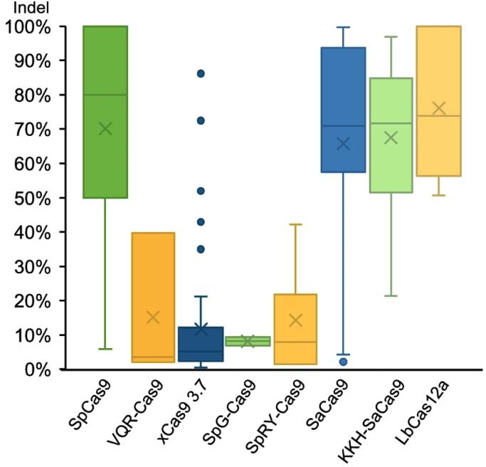Figure 6. Box plot summary of the targeted genome editing efficiency of 8 Cas variants tested in X. tropicalis embryos. The box plot for SpCas9 is based on the data from our previous studies [21, 24] |