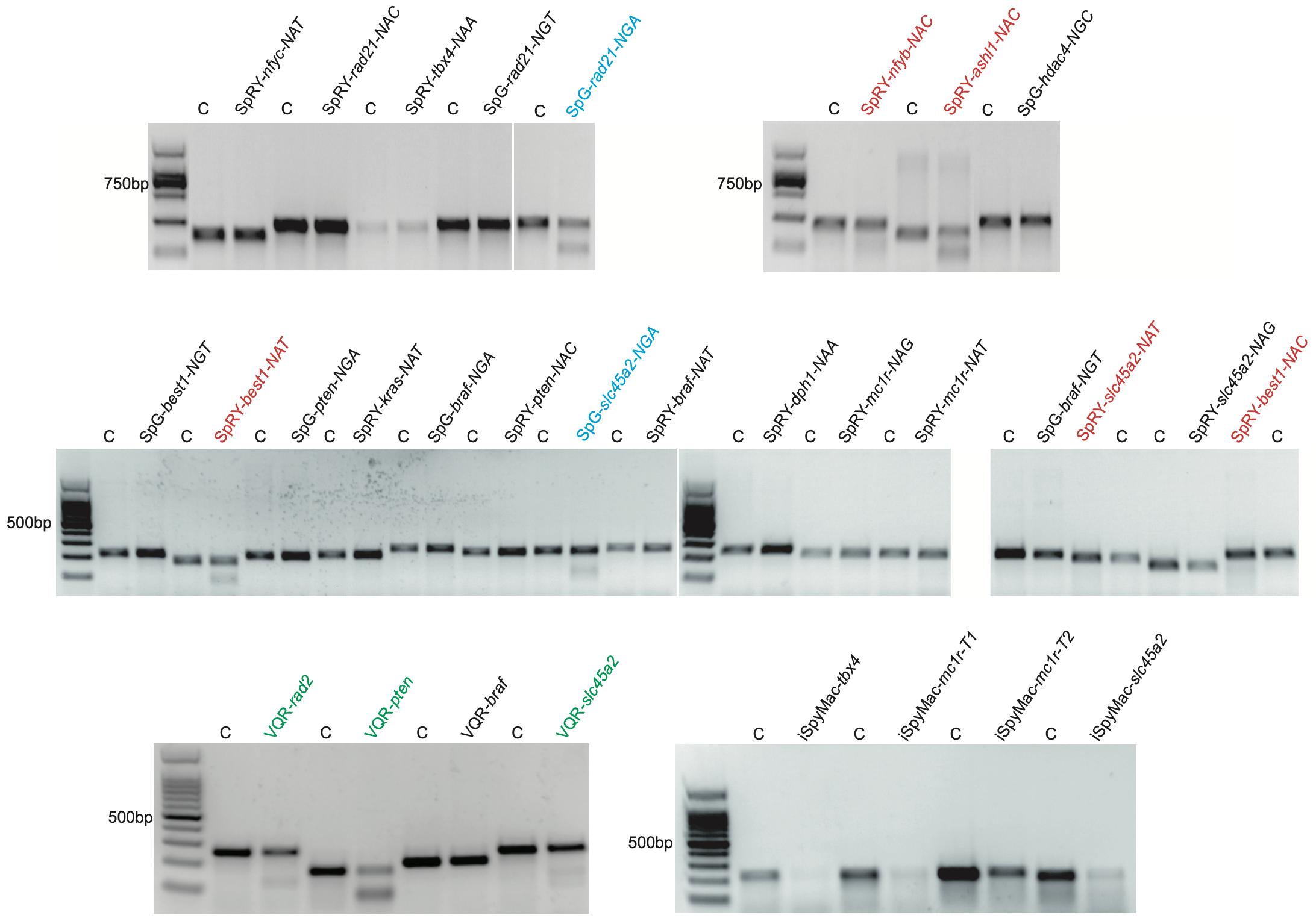 Fig. S3. T7EI assay data show the mutagenic activities of VQR Cas9, SpG Cas9, SpRY Cas9, and iSpyMac in X. tropicalis embryos. The targeting sites labelled in red, blue, and green are the effective ones for SpRY Cas9, SpG Cas9, and VQR Cas9, respectively. For target site designation, in addition to the gene name, the name of the Cas9 variant is used as a prefix and in some cases either the PAM motif or T1/T2 is indicated as a suffix. |