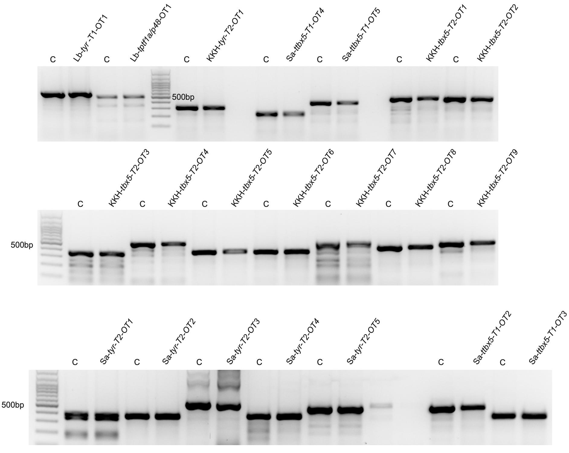 Fig. S10. T7EI assay data show no discernible mutagenic activities on potential off-target sites for LbCas12a, SaCas9, and KKH SaCas9 in X. tropicalis embryos. Potential off-target (OT) site is indicated as the last suffix. C, control. |