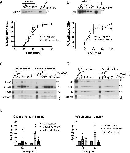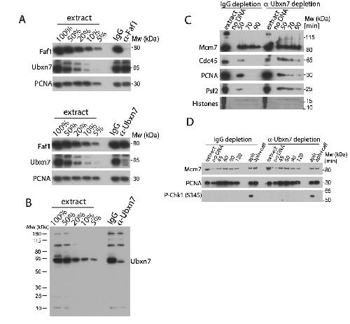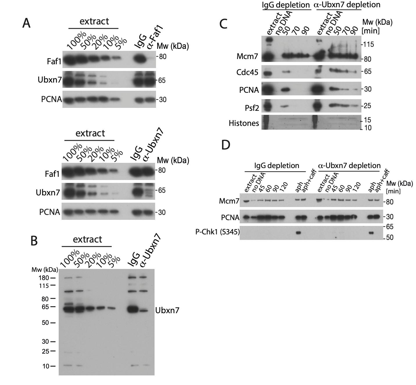 Supplementary Figure 3. (A) Immunodepletion of Ubxn7 or Faf1 does not co-deplete each other. Faf1 and Ubxn7 were immunodepleted independently as described in materials and methods. The level of remaining proteins in the egg extract was analysed through western blotting of a series of dilutions of egg extract and samples of IgG-, Ubxn7- and Faf1-depleted extracts. PCNA serves as an example of protein that is not affected by either immunodepletion. (B) Immunodepletion of Ubxn7 does not immunodepIete any other bands. Whole gel of Ubxn7 immunodepletion. (C) Immunodepletion of Ubxn7 delays replisome disassembly. An alternative example of experiment in Figure 2C. (D) Immunodepletion of Ubxn7 does not lead to checkpoint activation and Chk1 phosphorylation. Nuclei were isolated at indicated timepoints during replication reaction in IgG- or Ubxn7-depleted extracts. Nuclei samples were analysed by western blotting with indicated antibodies. As a positive control a sample of each extract was treated with polymerase inhibitor aphidicolin (inhibitor of Family B of polymerases which stops nascent DNA synthesis, leads to uncoupling of helicase and polymerase and induces checkpoint activation) or aphidicolin and caffeine (inhibitor of both ATR and ATM kinases which start S-phase checkpoint response). |