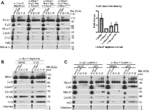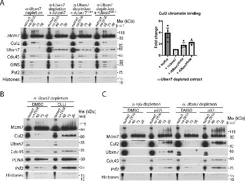 Figure 3. Ubxn7 depletion leads to accumulation of ubiquitylated Mcm7 and active Cul2Lrr1on chromatin.A, chromatin was isolated during the replication reaction time course in IgG-depleted and Ubxn7-depleted extract. Chromatin samples were analyzed as in Figure 1A with indicated antibodies. Representative experiment is presented (left). The fold increase of Cul2 signal on chromatin in Ubxn7-depleted extract at indicated time points was quantified in comparison to IgG depletion (n = 5) (right). The mean value is presented with all individual points and with SEM as error bars. B, chromatin was isolated during the replication reaction time course in IgG-depleted, Ubxn7-depleted, and Ubxn7-depleted extract supplemented with recombinant Ubxn7 at 10 μg/ml. Samples analyzed as in (A). Representative experiment (left). The rescue of the phenotypes by rUbxn7 was quantified in four experiments and the fold downregulation of Cdc45, Psf2 Cdc45 and Cul2 retainment presented as a mean value with SEM (right). |